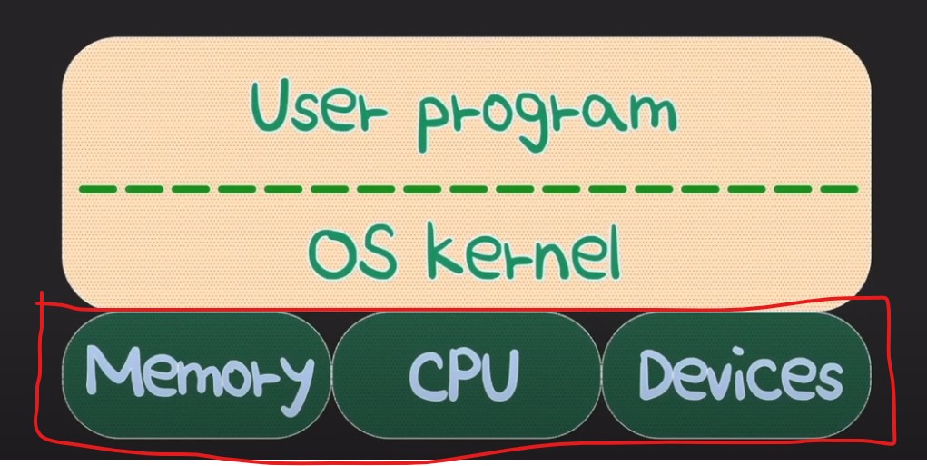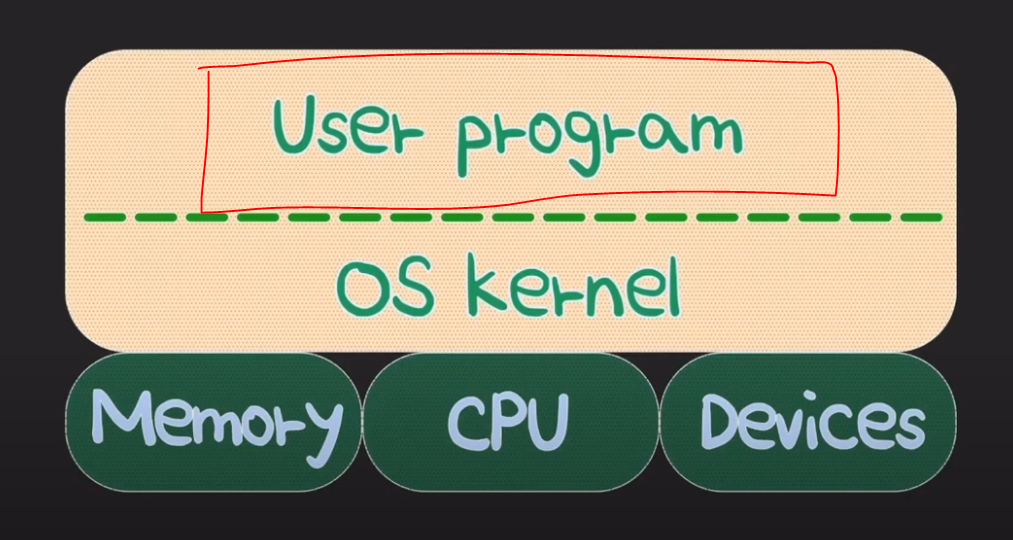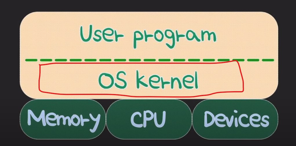 우리가 만든 프로그램(user program)은 OS Kernel을 통해서 컴퓨터(Memory, cpu , 그 외의 devices)내에서 실행이 된다.