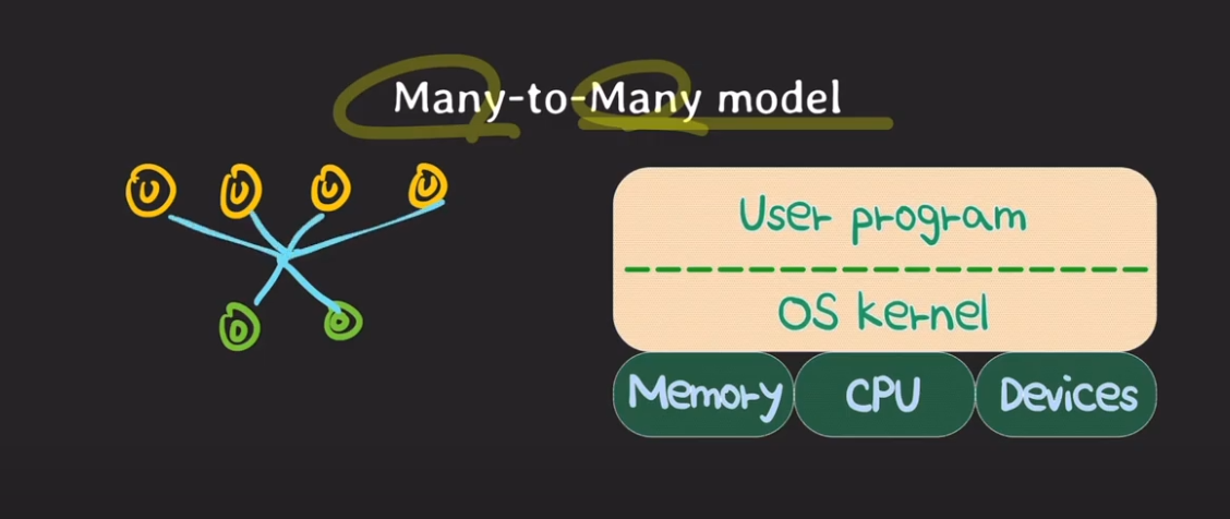 이때, cpu의 실행 단위는 os thread이므로 user thread는 반드시 os thread와 어떤 형태로든 연결이 돼 있어야지만 cpu에서