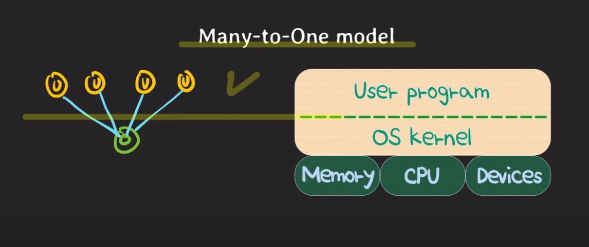 2. Many to One model : 여러 user thread가 하나의 os thread에 연결돼 있는 것.