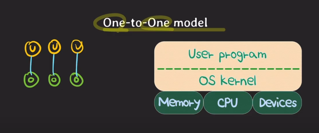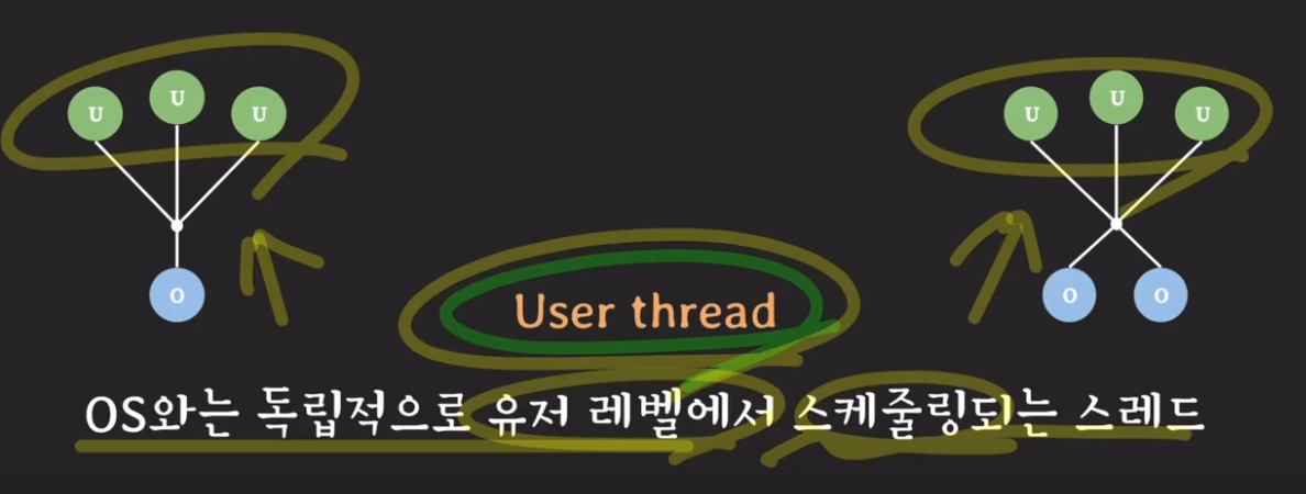 1. user thread는 os thead와 연결이 돼 있으니, 스케줄링을 포함한 user thead의 관리는 곧 OS에 위임됨을 의미한다.