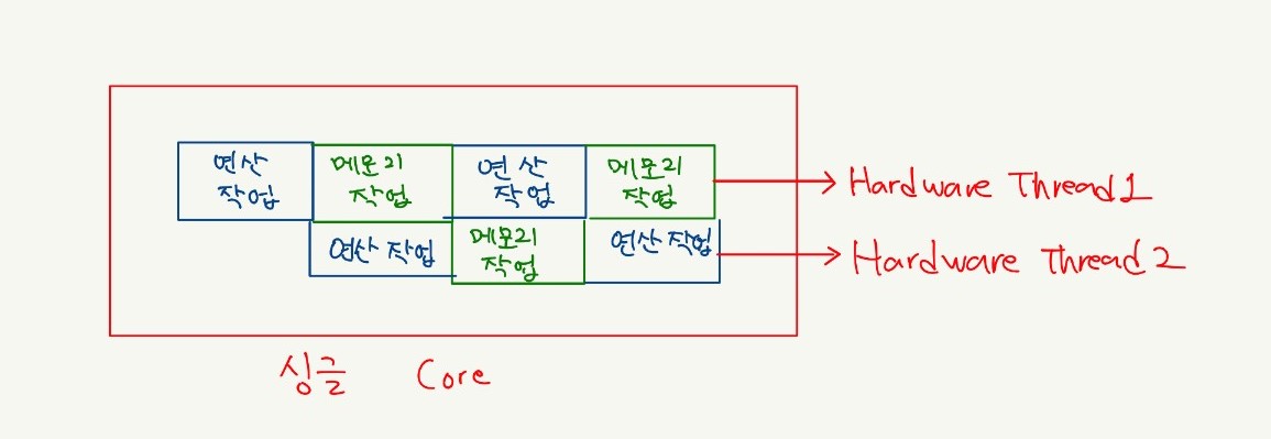 물리적인 core마다 하드웨어 스레드가 2개 이상일 때, 그 각각의 스레드를 hardware thread라고 불린다.