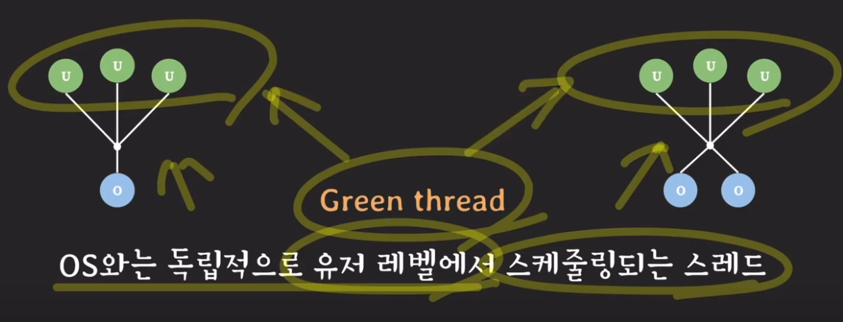 Green Thread : JAVA 초창기 버전은 Many to One 스레드 모델을 사용했는데, 이때 이 user thread들을 Green Thread라고