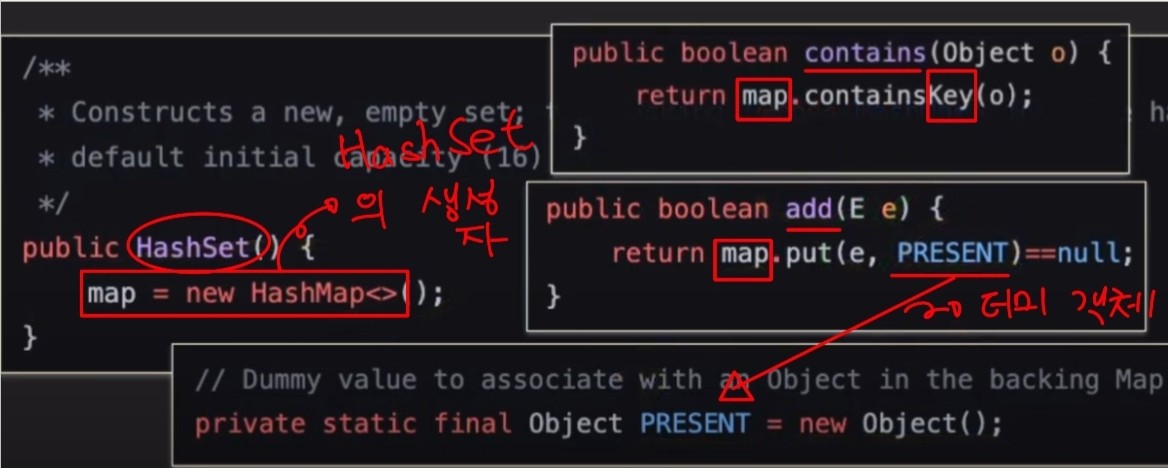 또한, HashSet에서 데이를 조회(contains)할 때에는, 내부적으로 HashMap 객체에서 key값을 조회하는 것과 같다.
