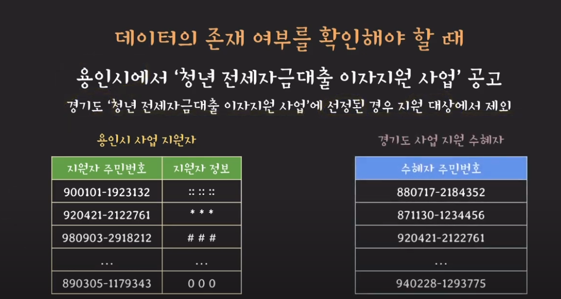 용인시 사업 지원자의 주민번호와 경기도 사업 지원 수혜자의 주민번호의 교집합(Intersection) 원소들을 구하면 된다.