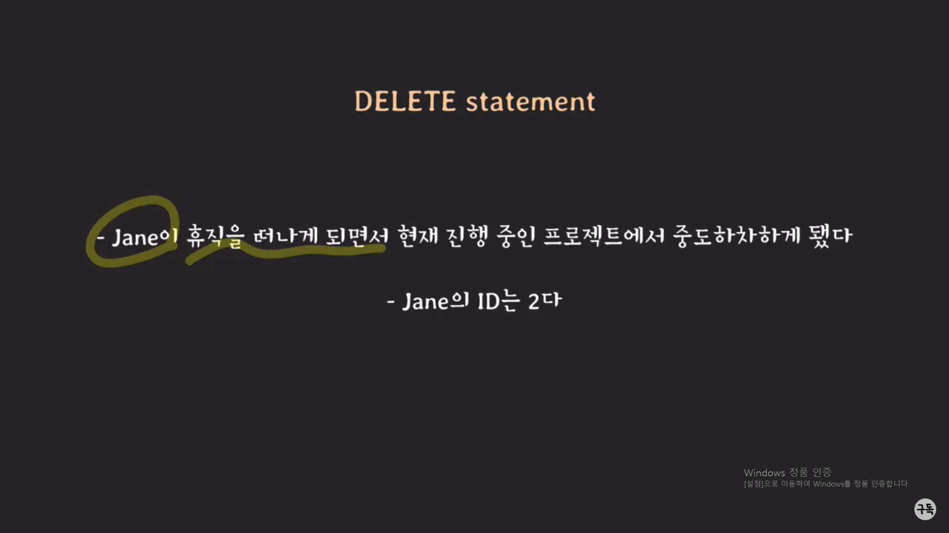 -> <>의 뜻이 "~을 제외한"이라는 뜻이며, 즉 empl_id가 5인 튜플 중에서 2001 프로젝트를 제외한 나머지 튜플을 모두 삭제