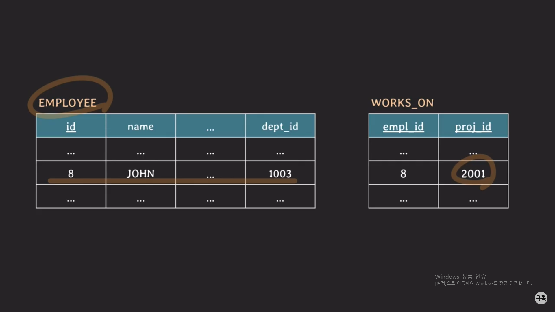 (id,empl_id가 각각 어느 테이블에 소속된 attribute인지가 헷갈린다. 그래도 employe.id, works_on.empl_id 처럼 앞에 테