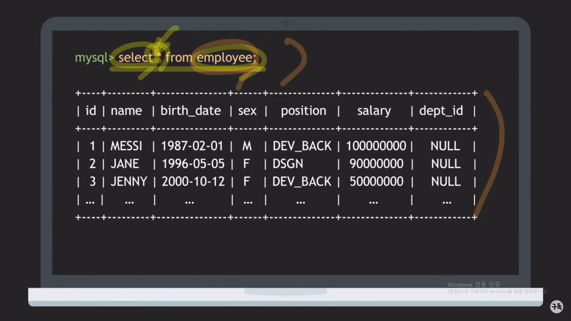 -> 위 그림을 보면, (name,birth_date,sex,position,id)가 있다. 서두에서 insert 시에, 모든 Attribute값을 순서대로 넣어 줘야