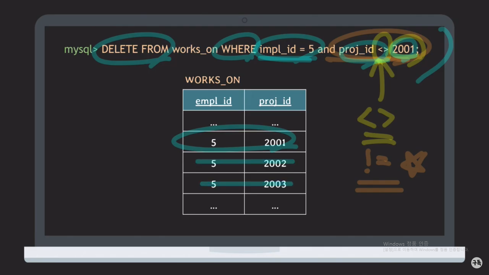 A. delete from works_on where empl_id = 5 and proj_id <> 2001 을 실행!!
