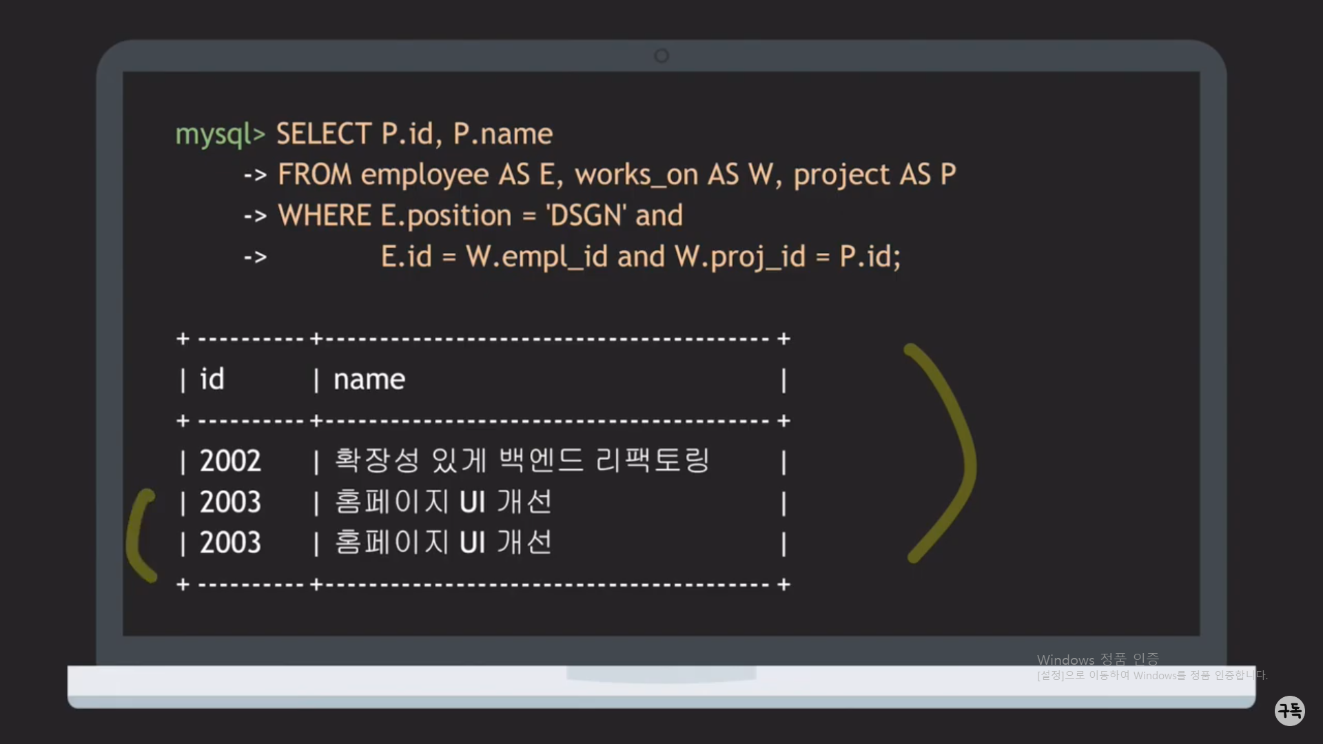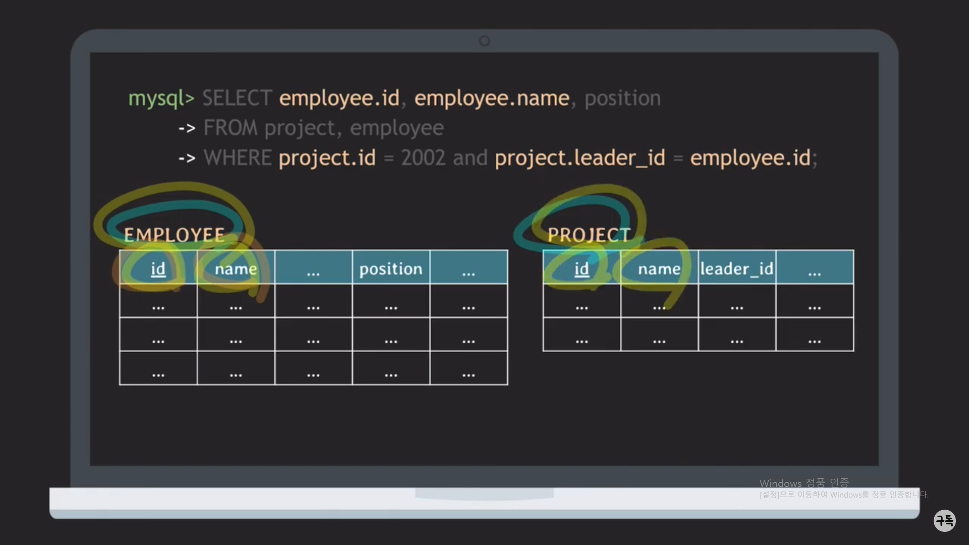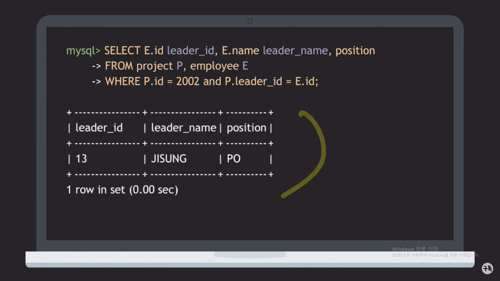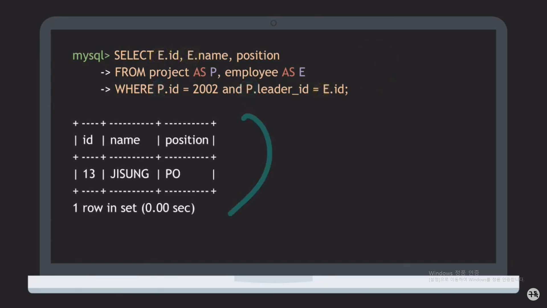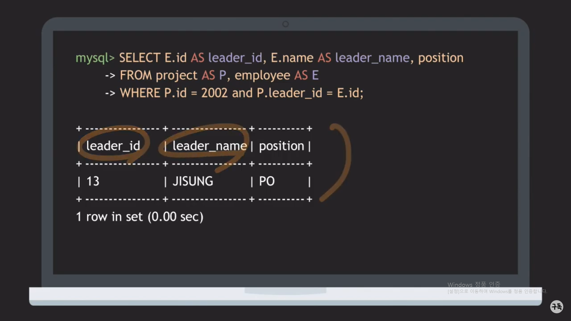 4. 최종적으로 employee 테이블에서 우리가 관심있어 하는 attribute인 {id, name, position}을 가져 오면 된다.