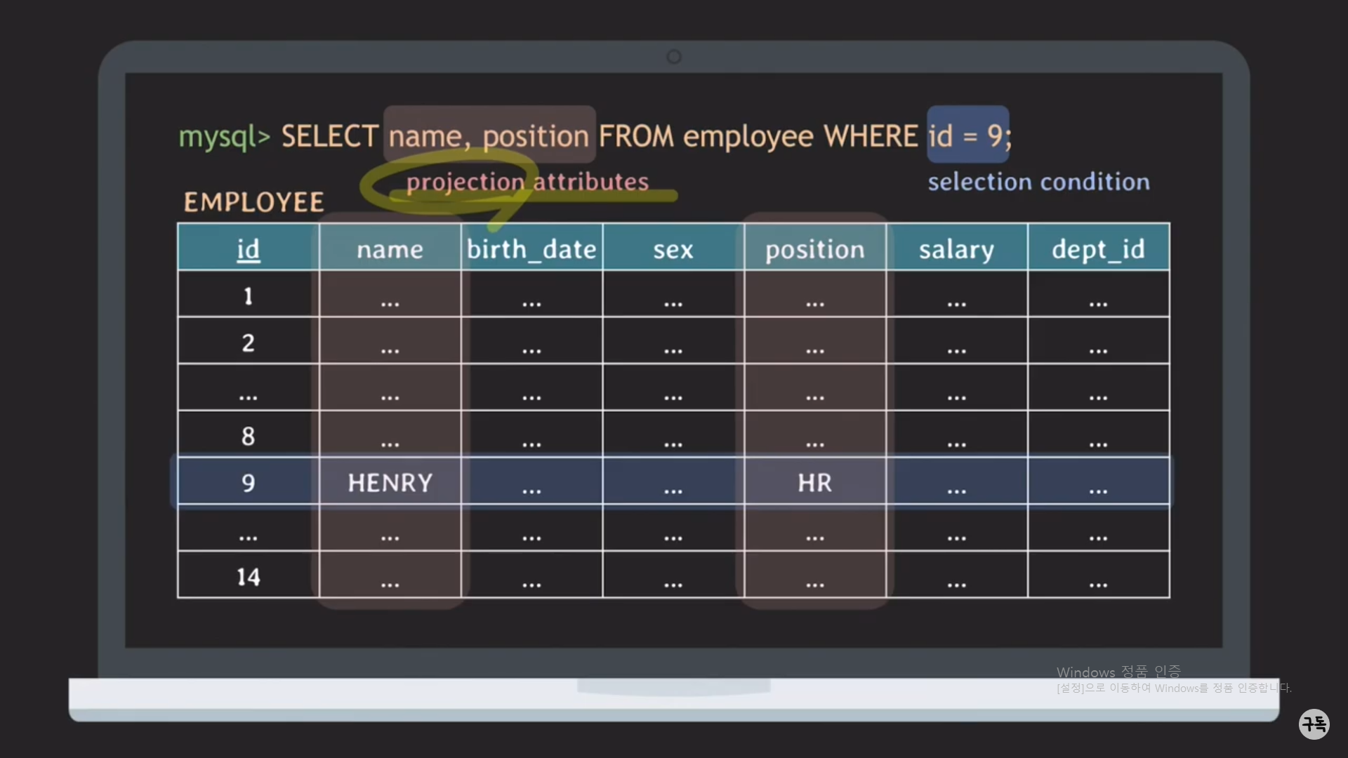 WHERE id=9 와 같은 조건문을 selection condition이라고 부른다.