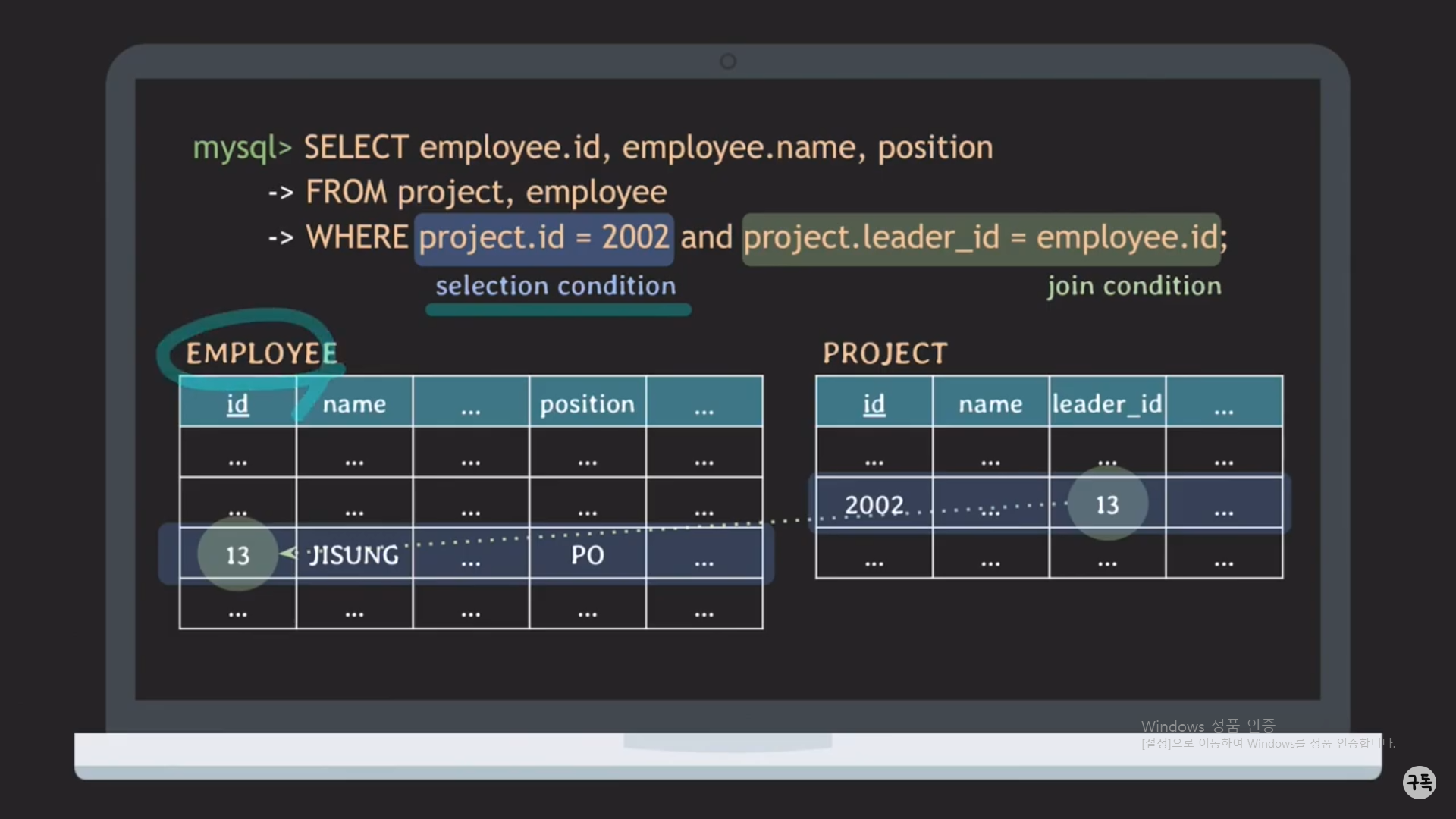 3. WHERE뒤에는 selectin conditon(선택 조건)과 join conditon(연결 조건)으로 구성이 된다.