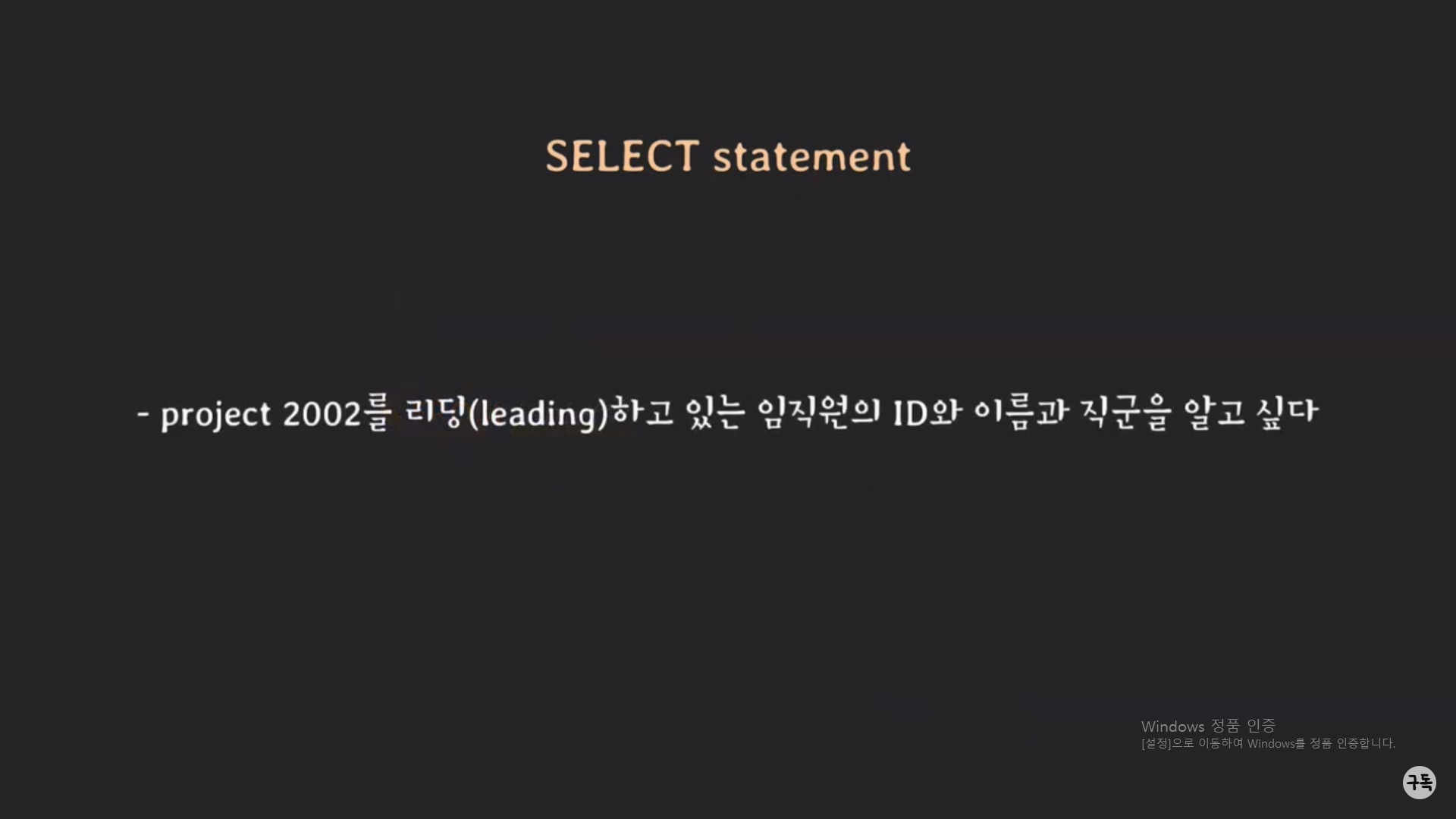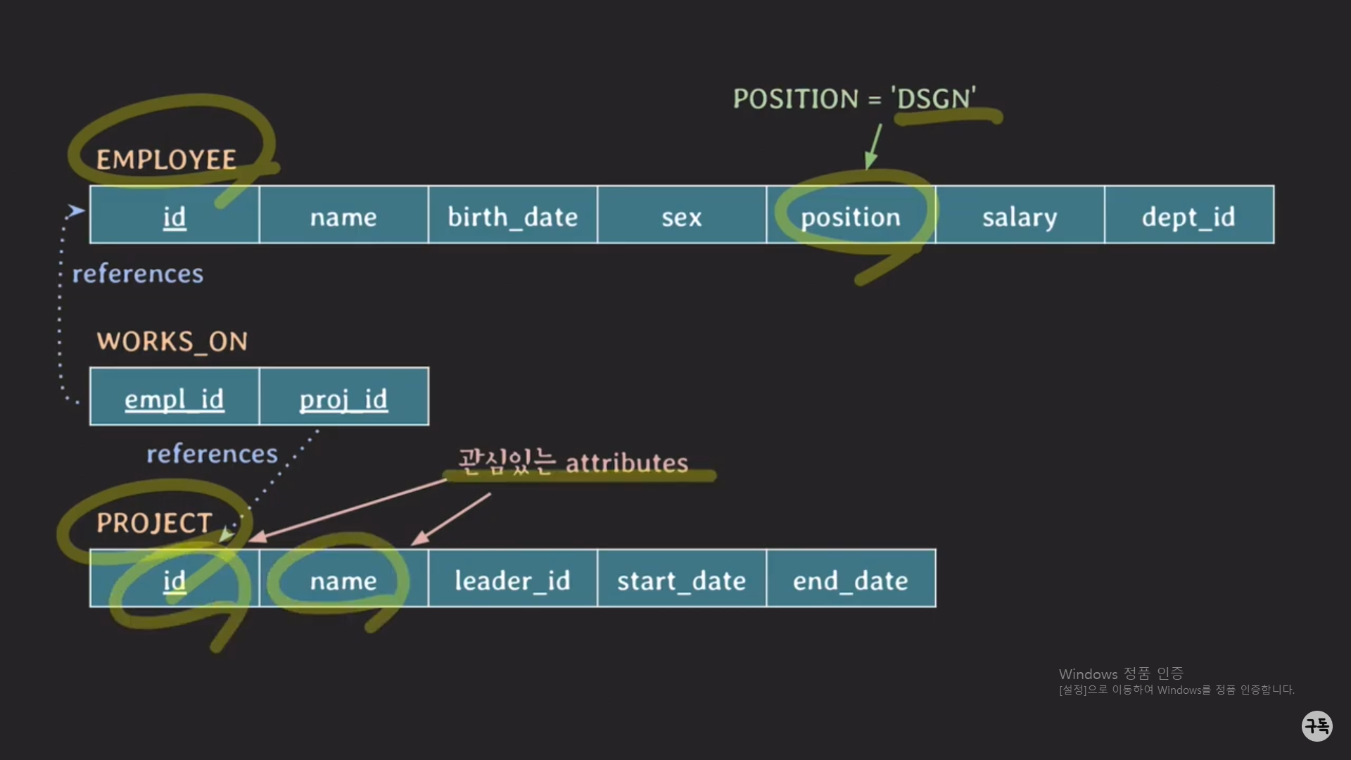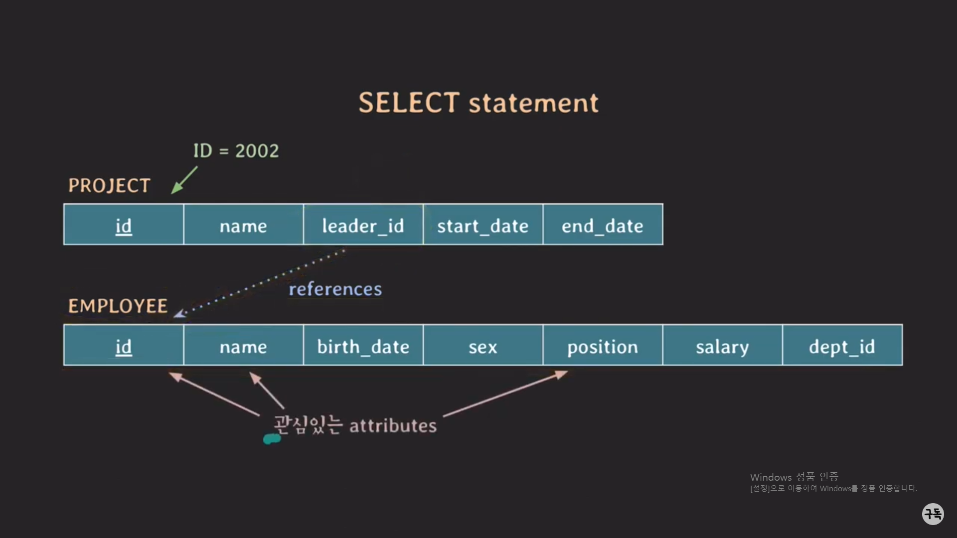 여기에서의 selection conditon(선택 조건)은 "프로젝트의 id(= project.id)가 2002"인 tuple이고