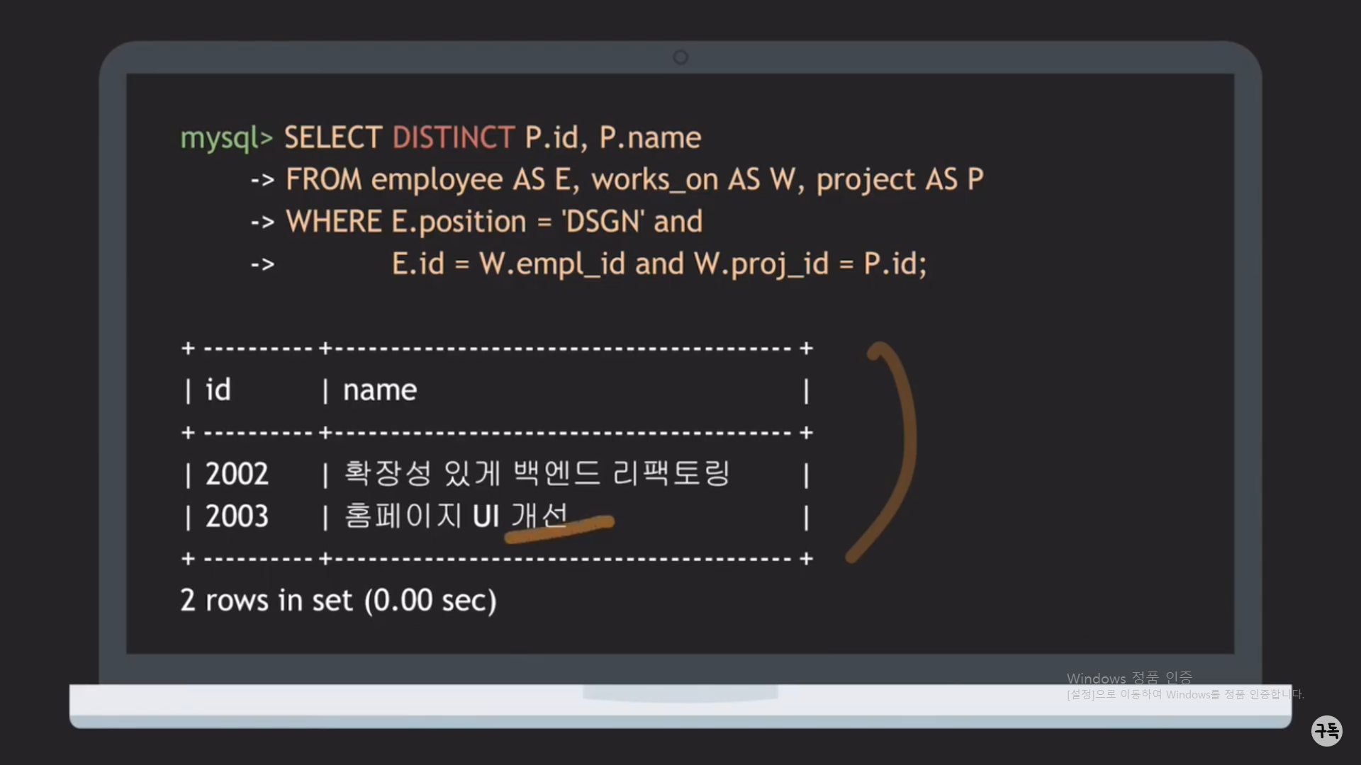 AS를 이용함으로써 "PROJECT", "EMPLOYEE"를 일일이 타이핑하지 않아도 되게 되었다.