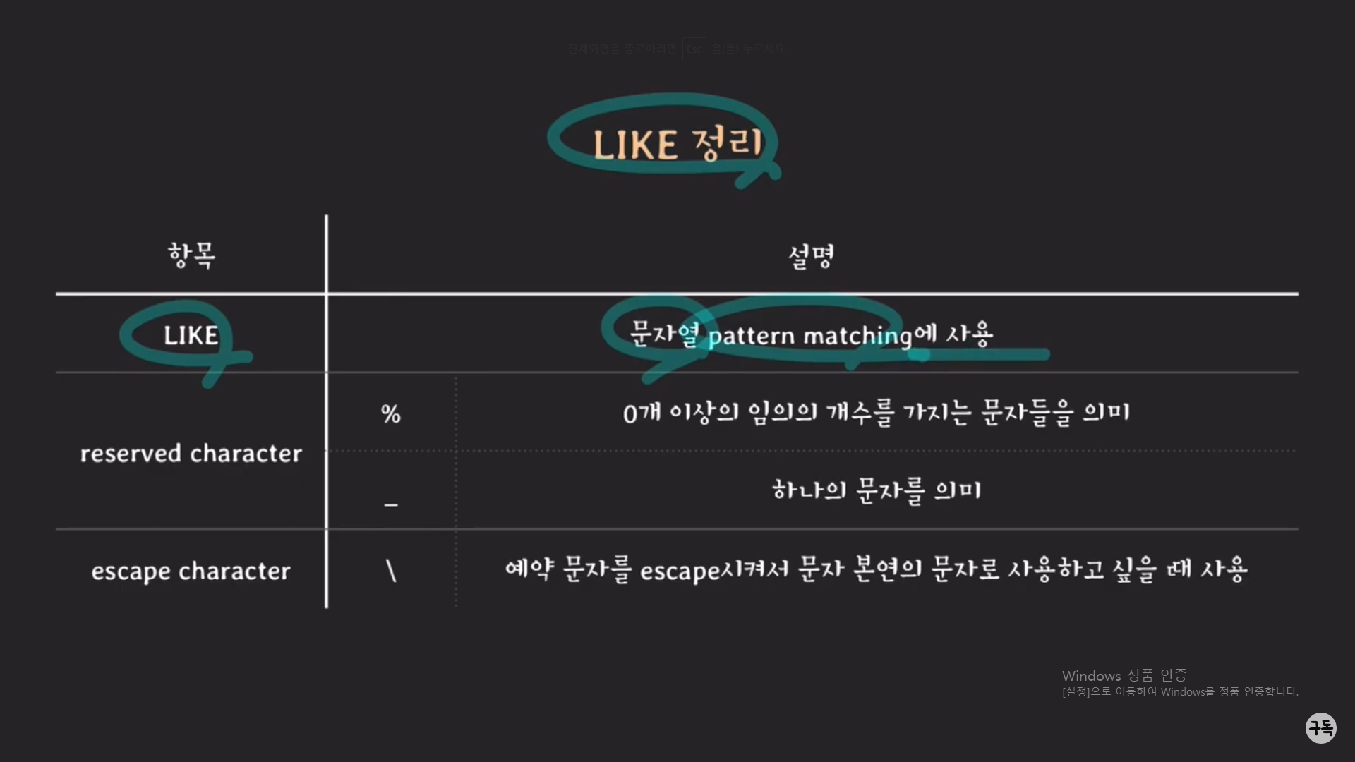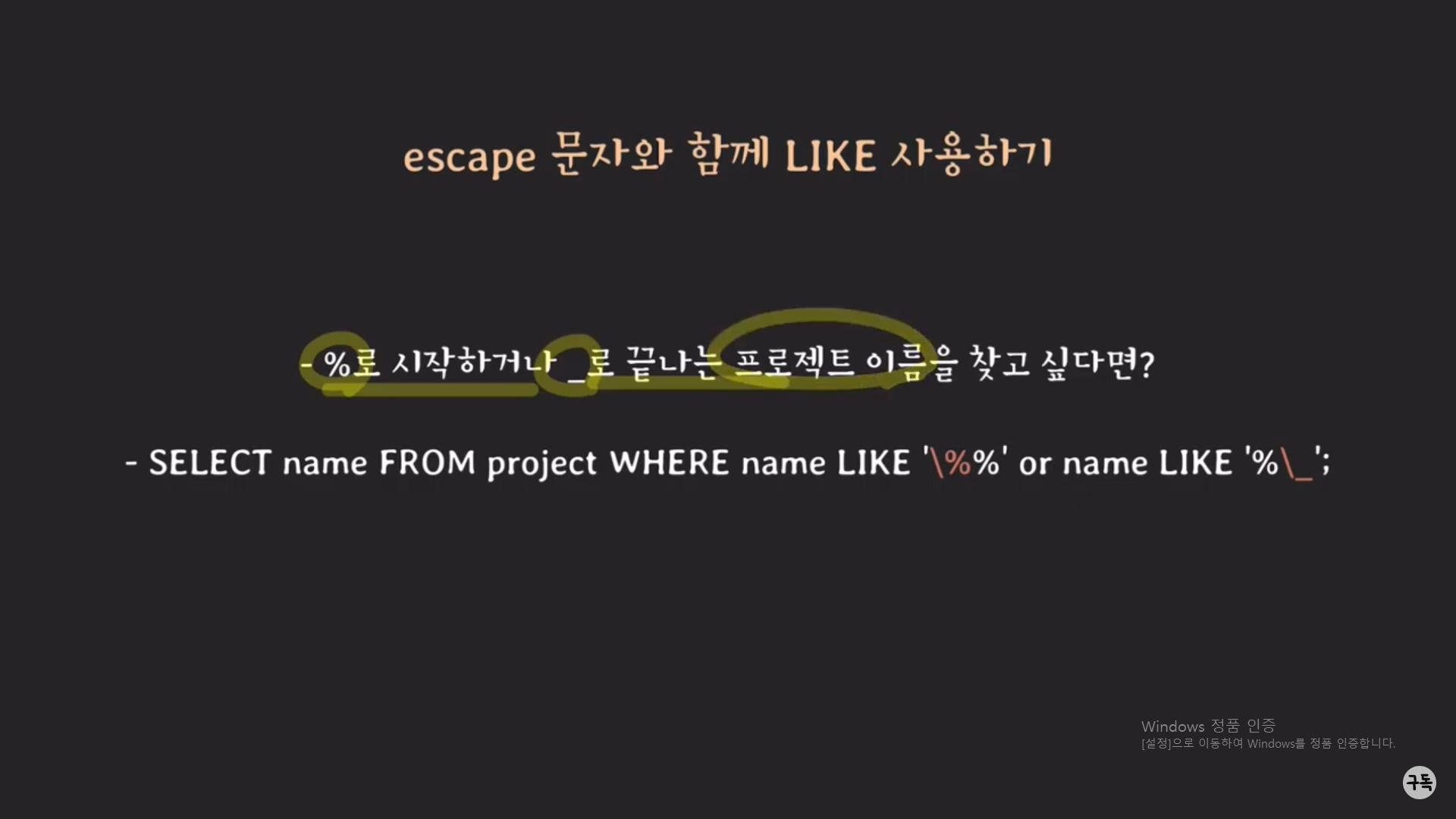 escape 문자 : %, _ 와 같이 특별한 의미를 가지는 문자가 있을 때, 특별한 의미로서가 아니라 문자 본연의 의미를 가지도