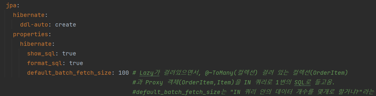 -> 이 옵션을 사용하면 컬렉션(OrderItem)이나, 프록시 객체(OrderItem, Item)를 한꺼번에 [설정한 size 만큼] IN 쿼리로