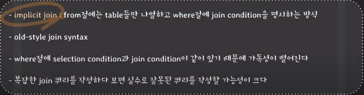 위와 같이 WHERE절 뒤에서 JOIN condition에 의해서 테이블을 JOIN시켜주는 것을 implicit JOIN이라고 한다.