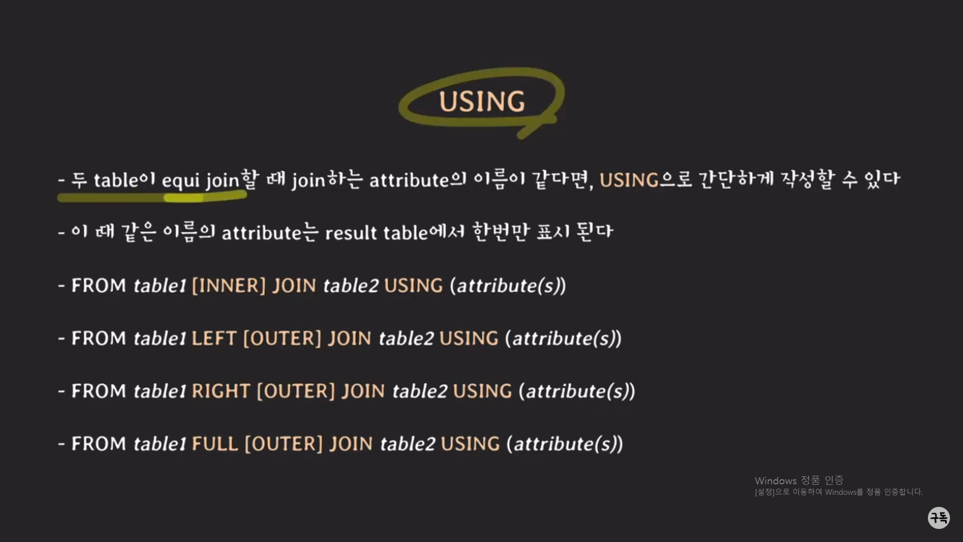 USING 키워드를 사용하면, 위 그림과 같이 이름이 Attribute이름이 같은 tuple들은 별도의 table로써 따로 빼준다.