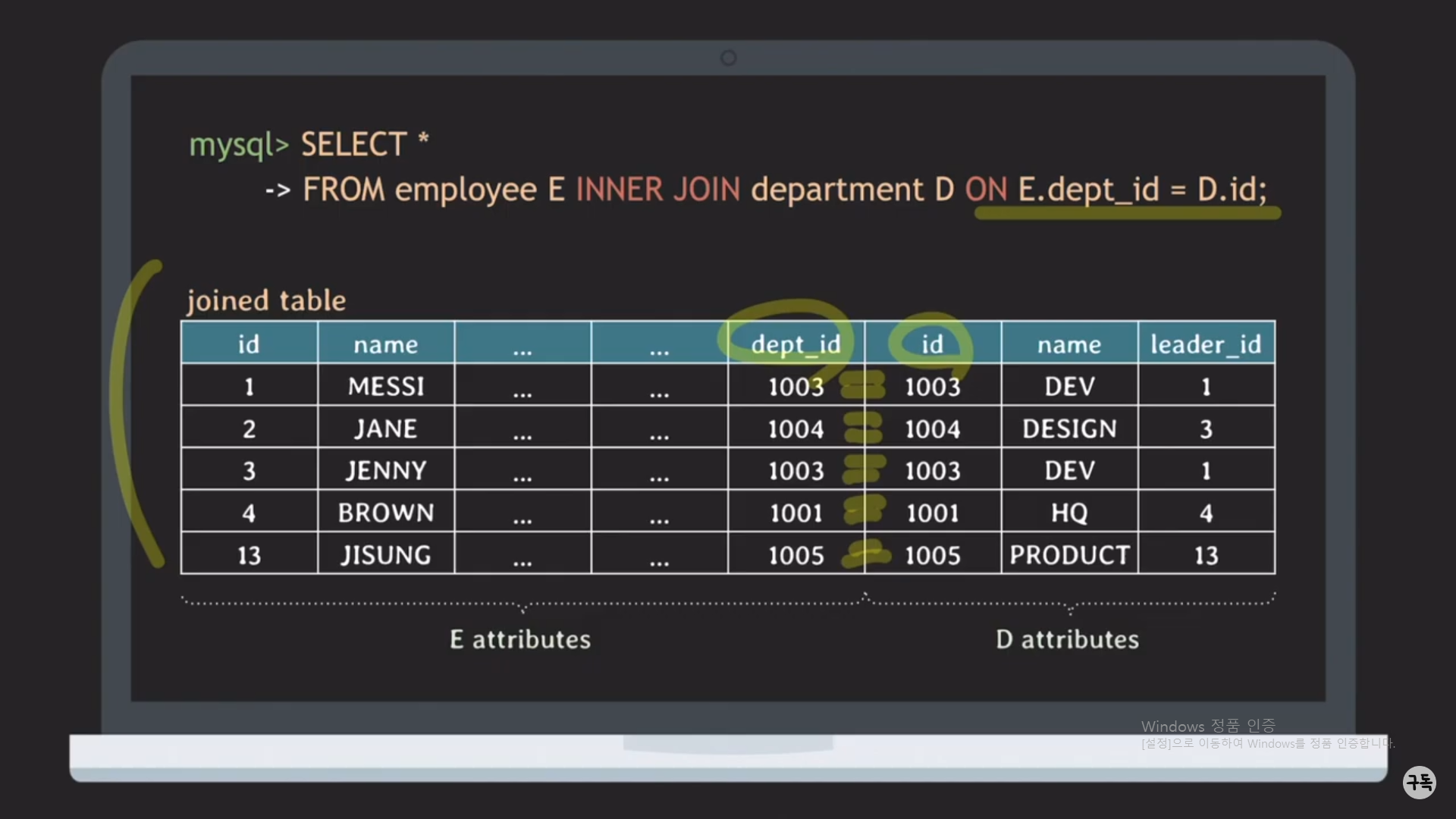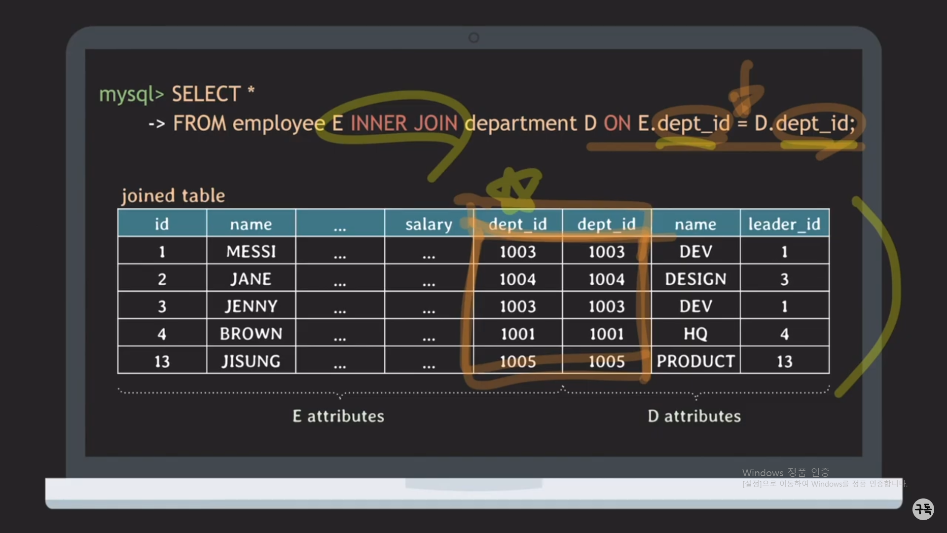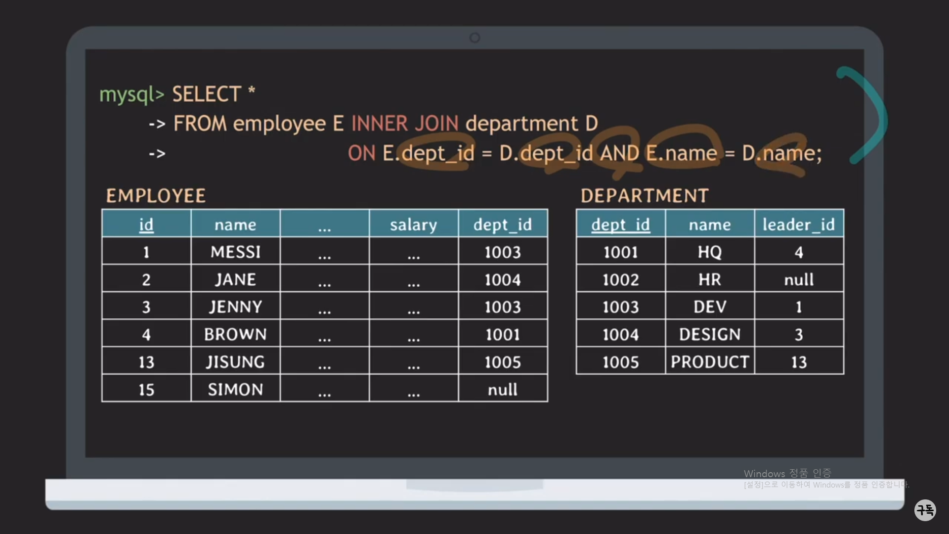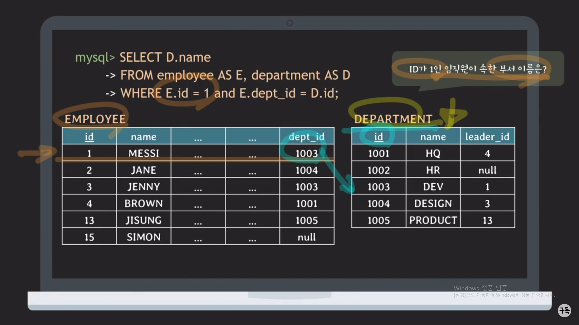 WHERE절 뒤의 E.dept_id = D.id라는 JOIN condition이 있다.