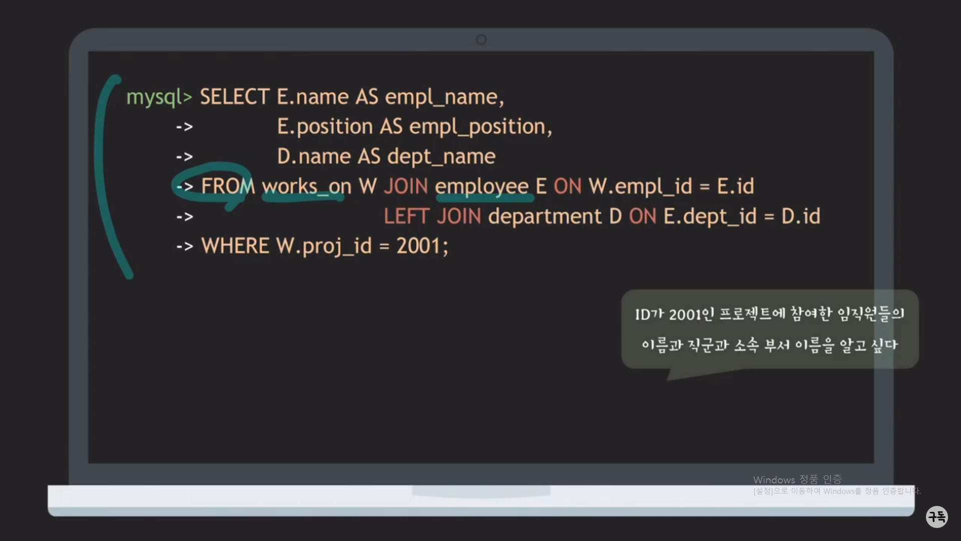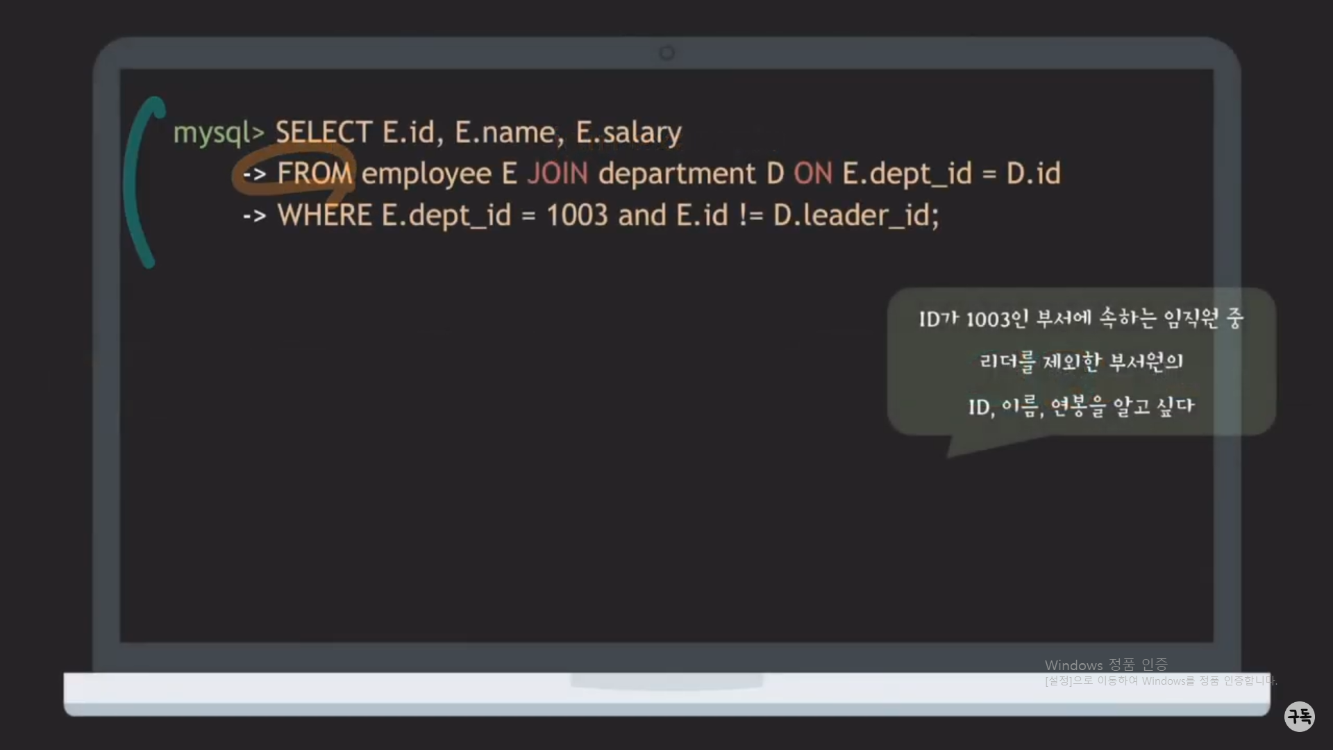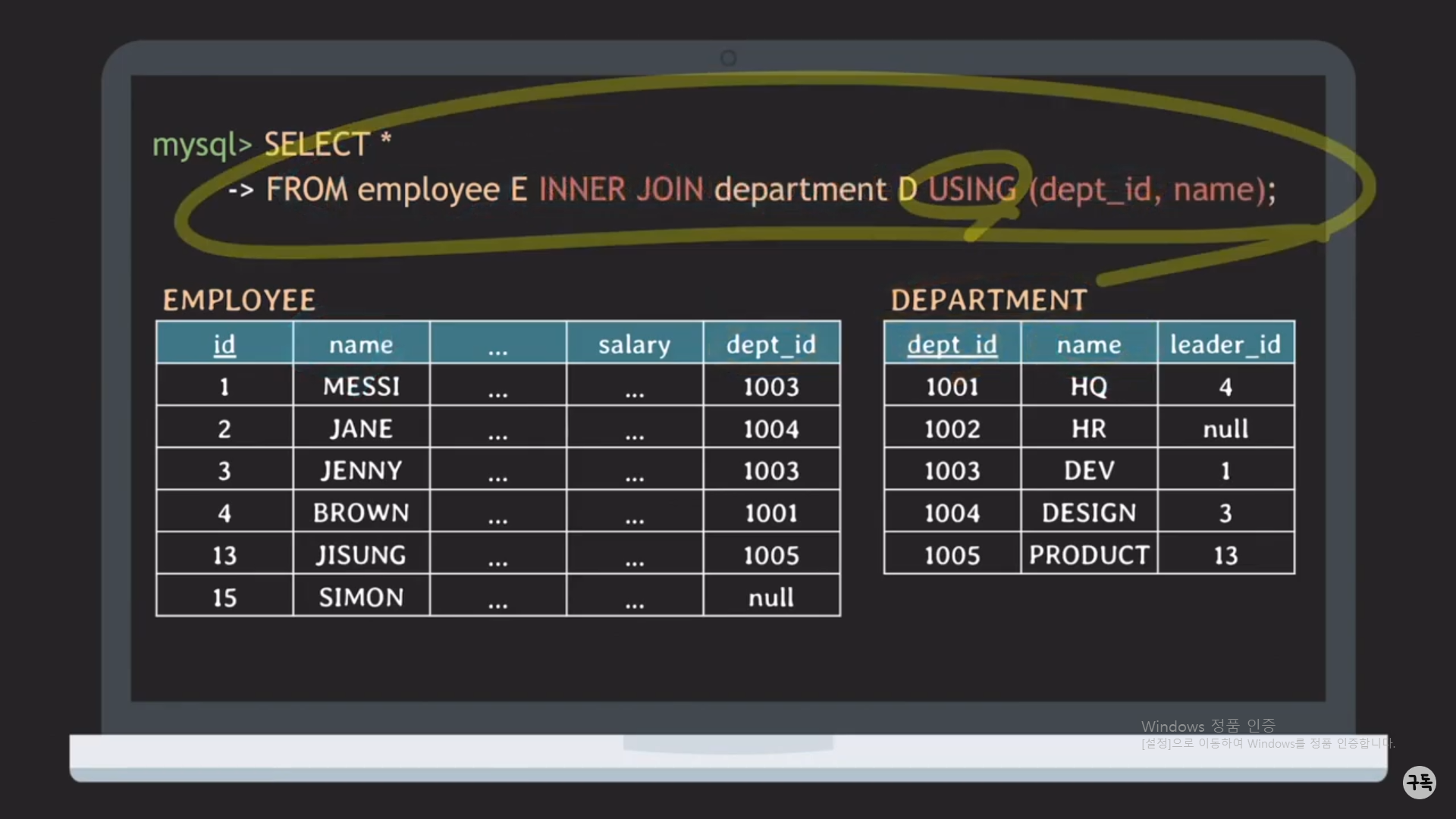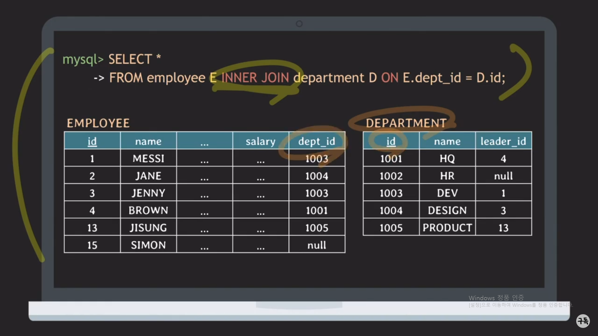 WHERE절 뒤의 E.dept_id = D.id라는 JOIN condition이 있다.