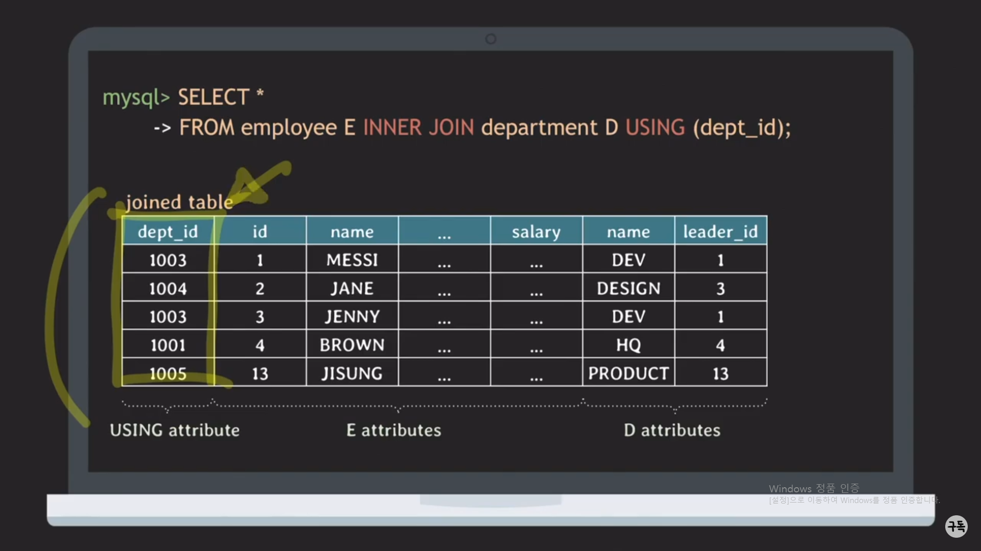 2. ON뒤의 Join condition을 보면 똑같은 이름인데 dept_id를 2번씩이나 써 줘야 한다는 것이다.