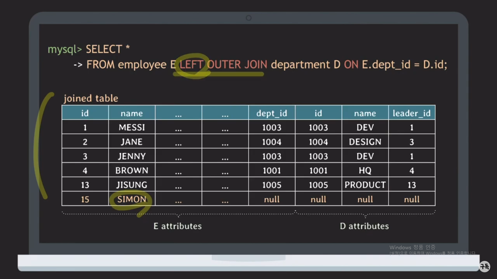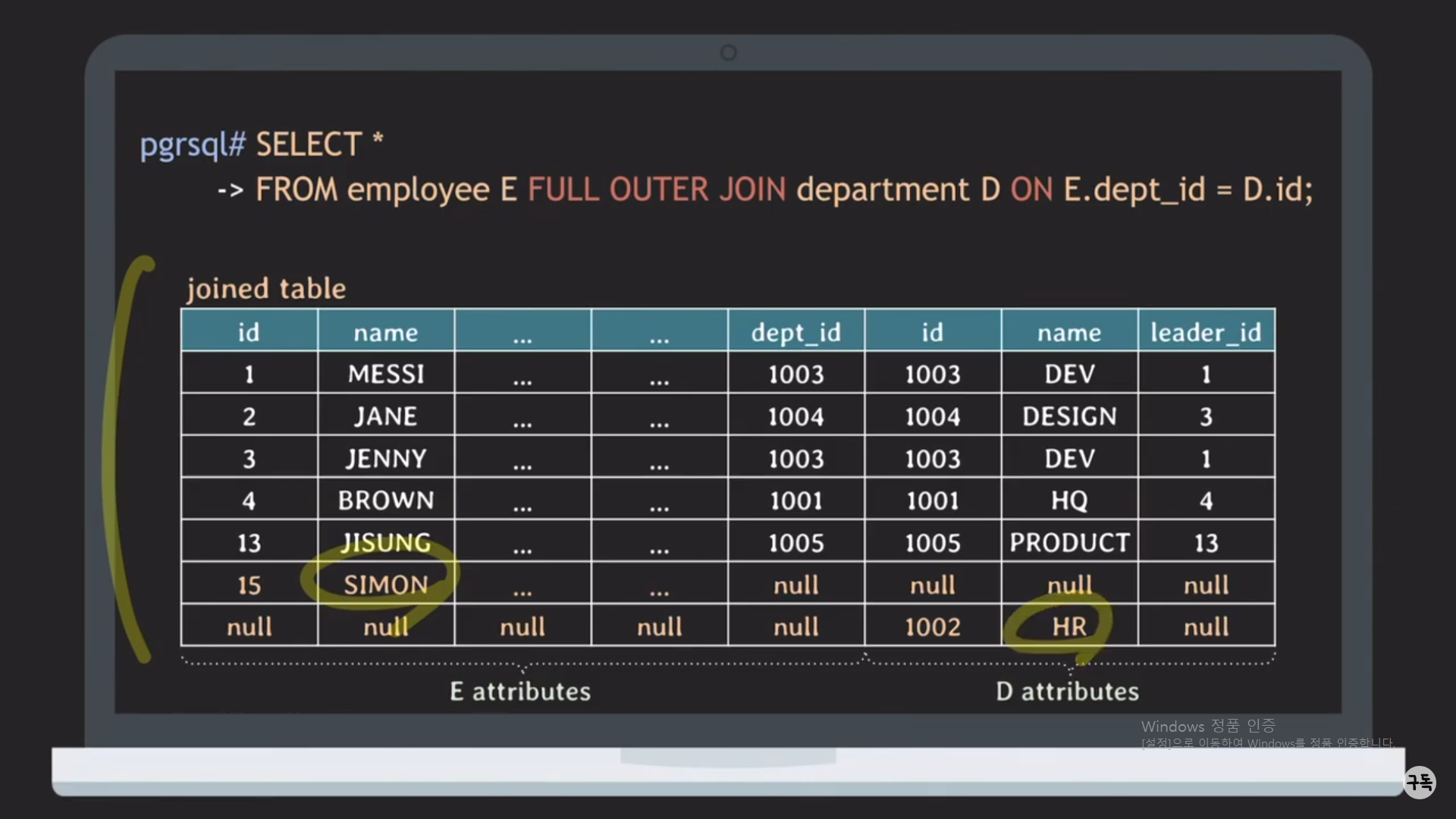 NULL = D.id의 결과값은 UNKOWN이다. 즉 join condition의 결과 true가 아니므로 join이 되지 않은