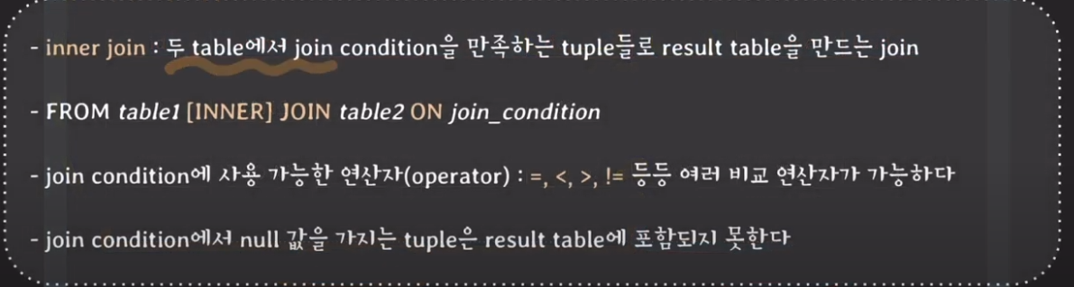 2. WHERE절 뒤에는 selection condition만 적고, join condition은 FROM뒤에 적자!!!