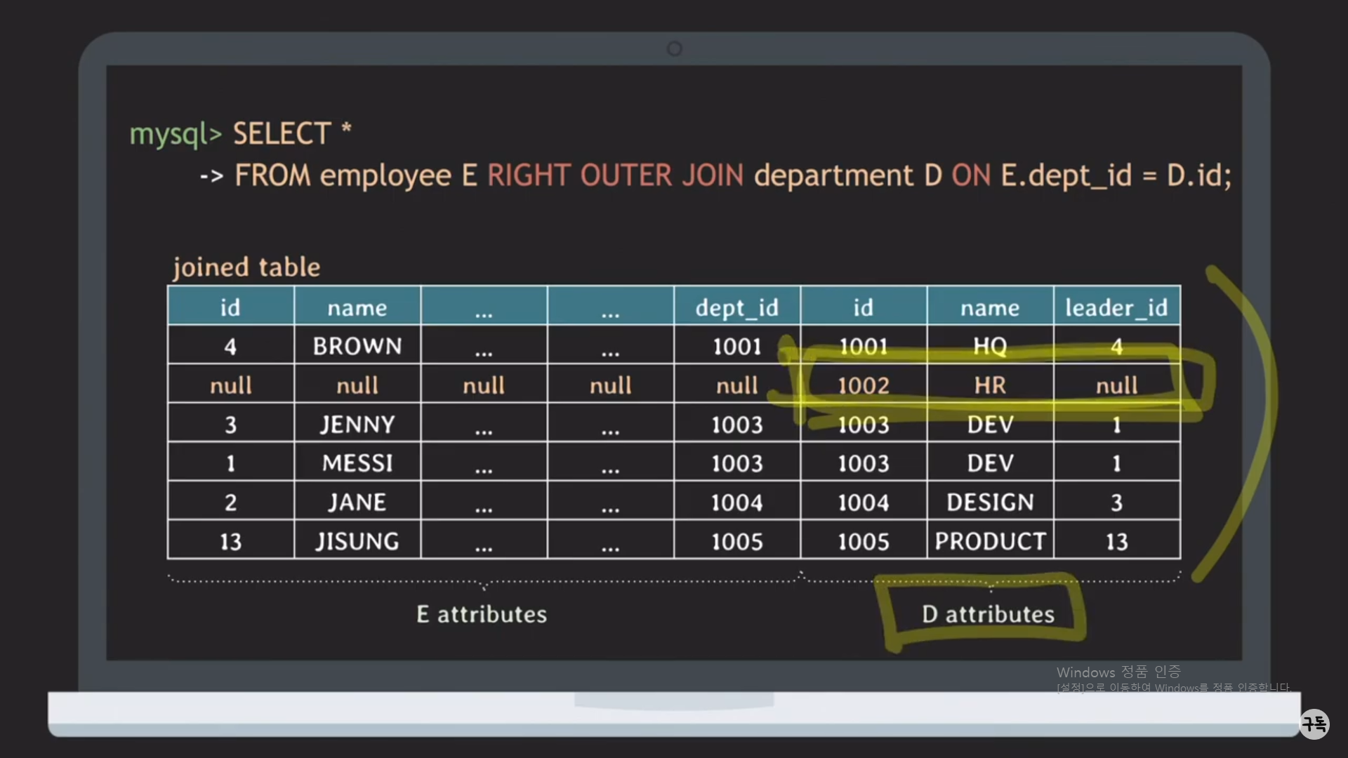 -> "E.dept_id = D.id"에서 D.id = 1002이다.