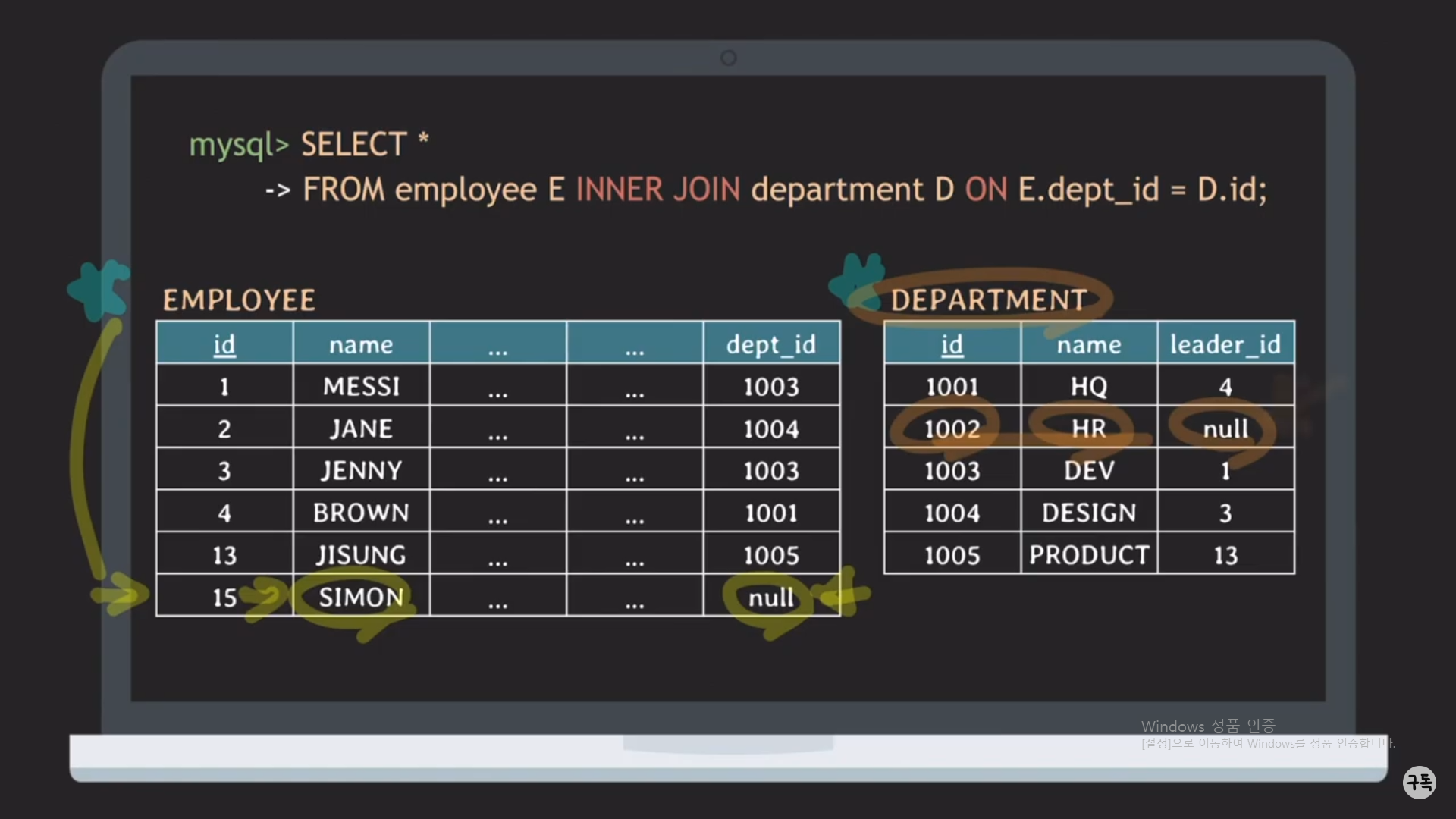 1. Employee 테이블의 6번째 tuple의 dept_id가 NULL이라는 점