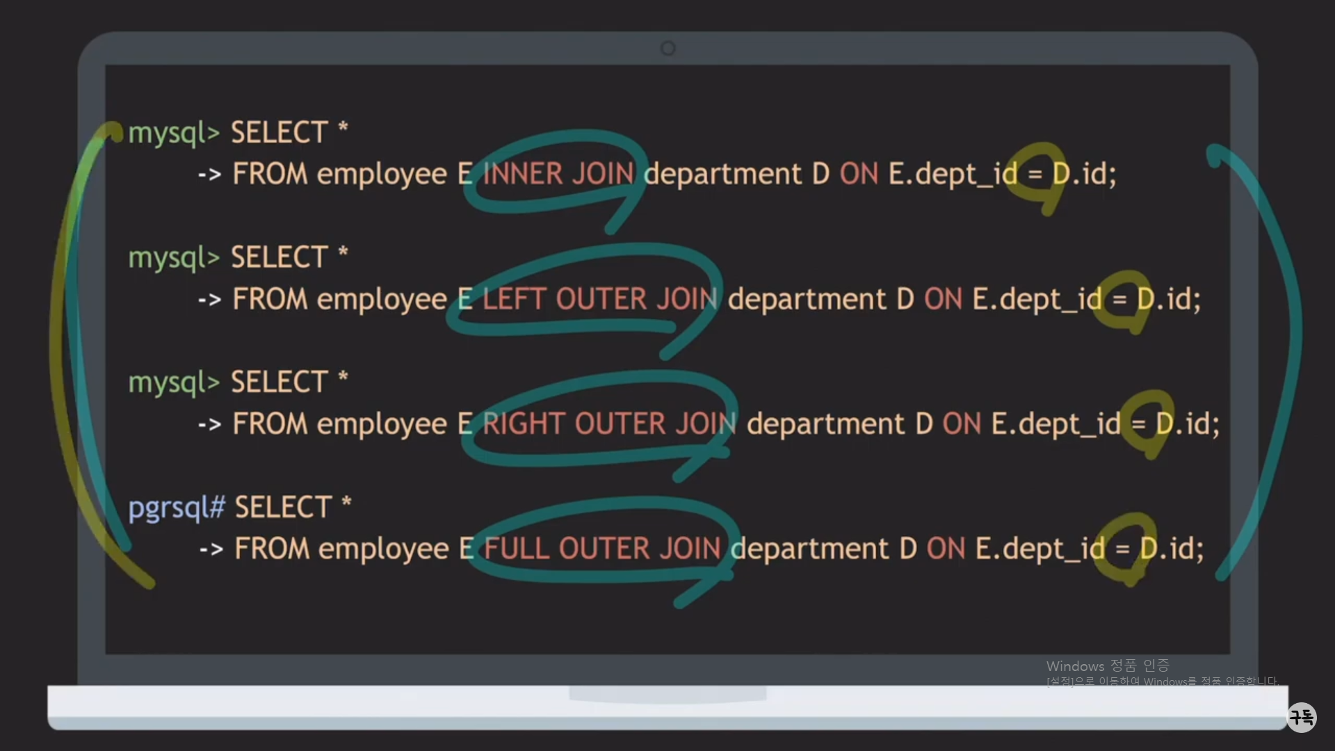 FULL OUTER JOIN은 Mysql에서는 지원이 되지 않는 것을 기억해 놓자(그래서 Postgre SQL에서 실행을 시켰다.)