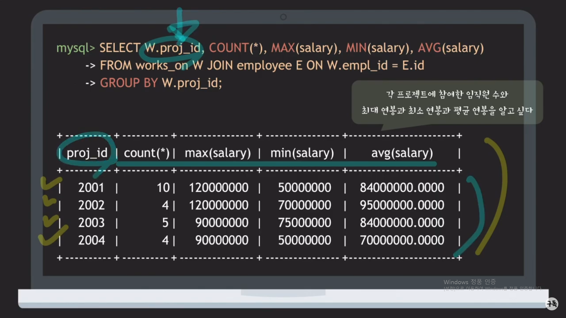위 그림에서는 works_on.proj_id를 기준으로 그룹핑을 하였다.