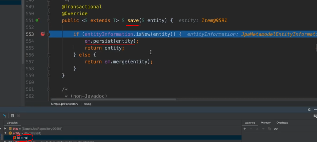 [객체]의 식별자(id)가 null이므로, DB에는 저장돼 있지 않은 엔티티라고 판단을 해서 아래의 코드에도 나와 있지만