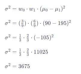임계값을 T라고 할 때, 클래스 간 분산은 다음과 같이 계산됩니다: