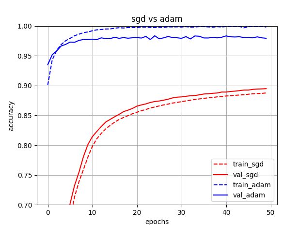 plt.legend(['train_sgd','val_sgd','train_adam','val_adam']는 위 #1 ~ #4에 해당하는 그래프에 대한 범례, 즉 설명하는 코드이