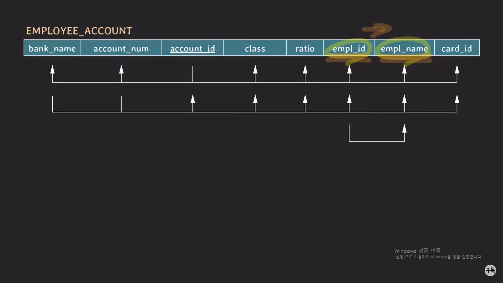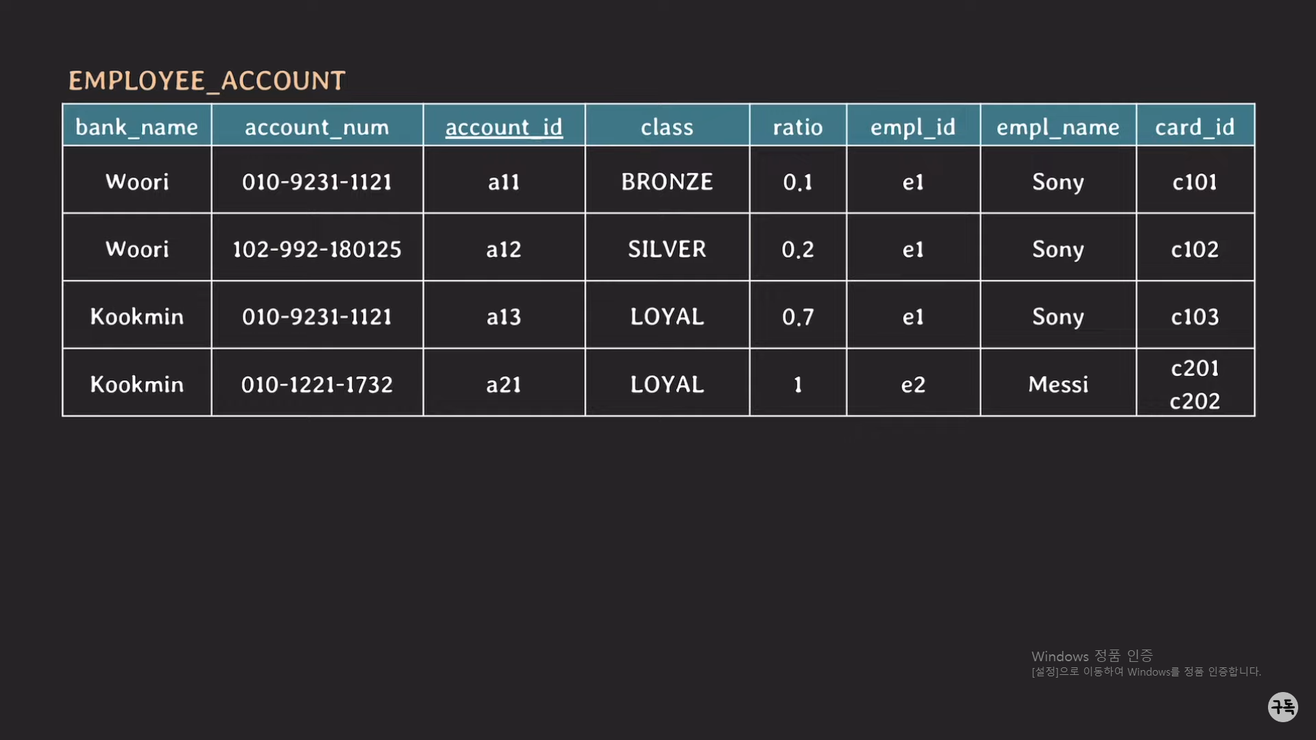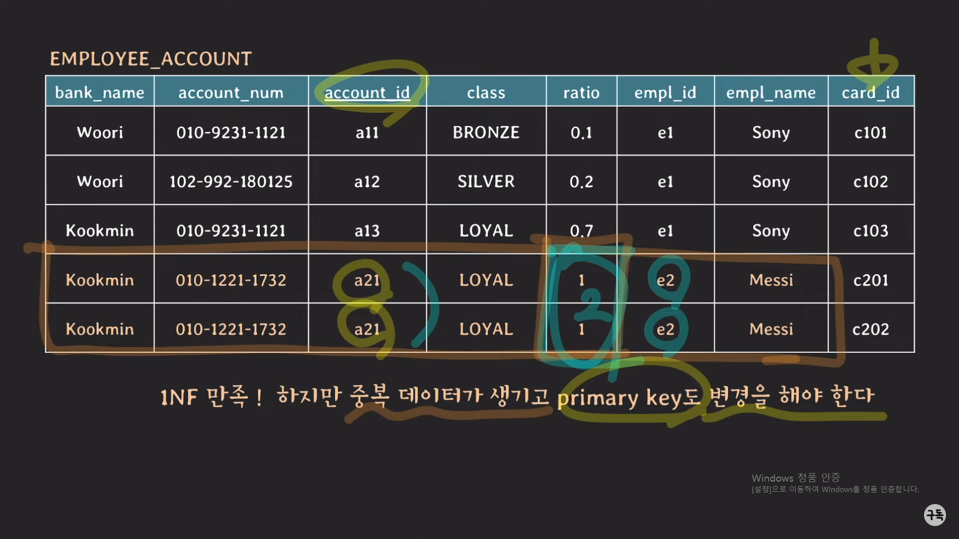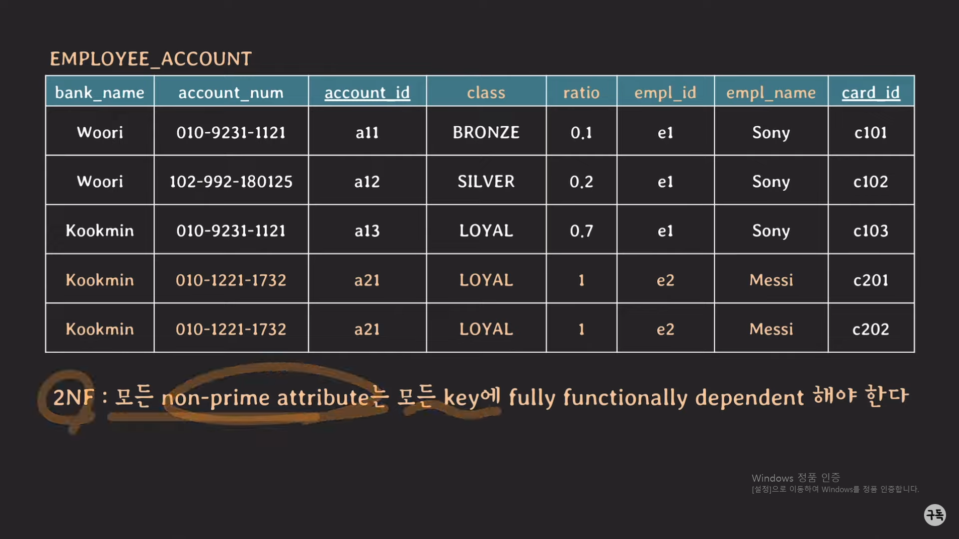위의 1,2에 의해서 EMPLOYEE_ACCOUNT Table은 2NF를 만족하게 되었다.