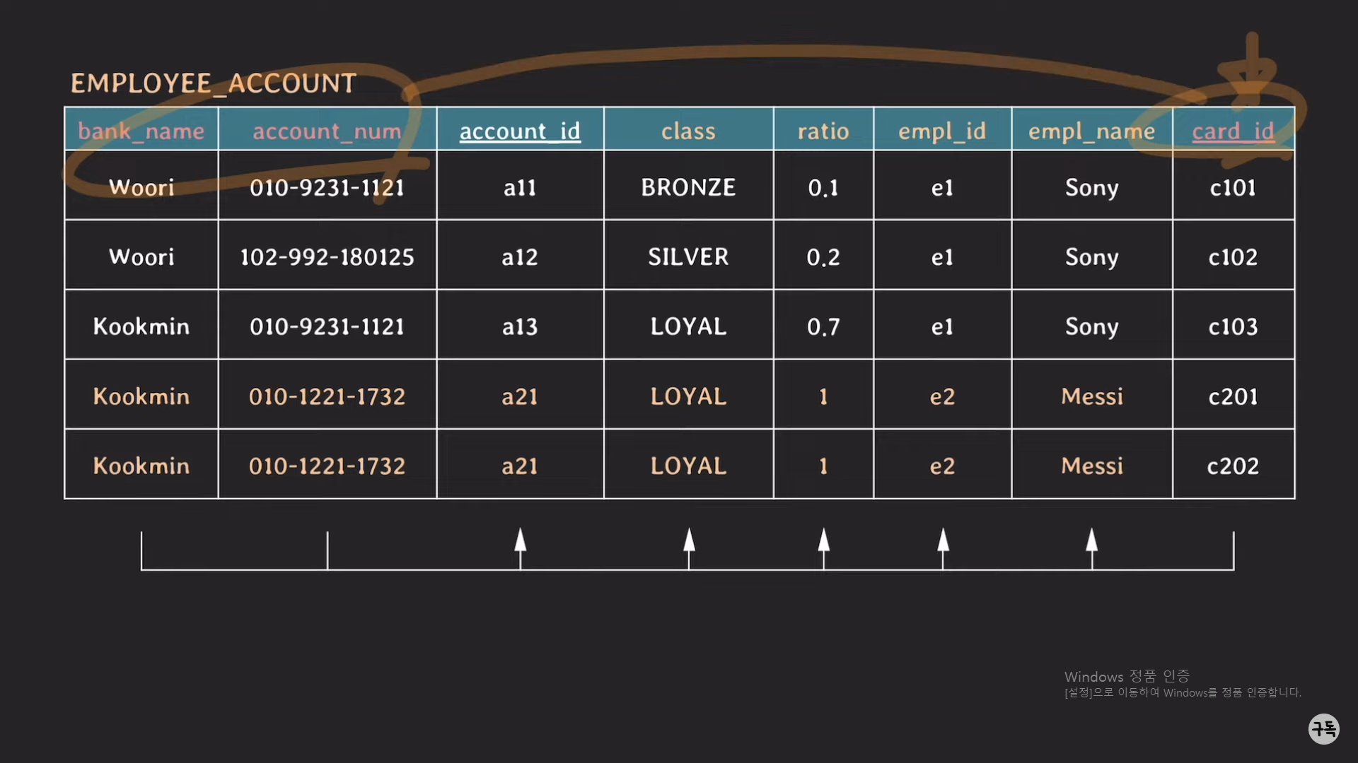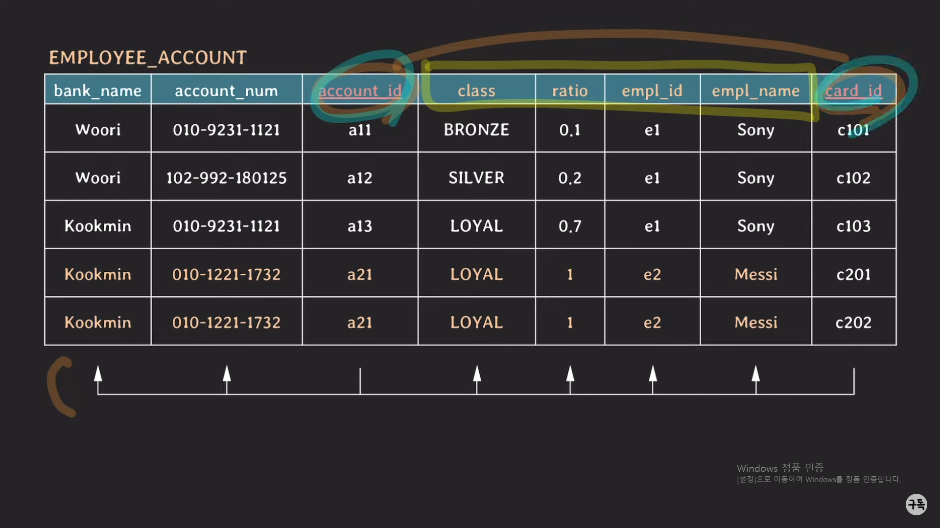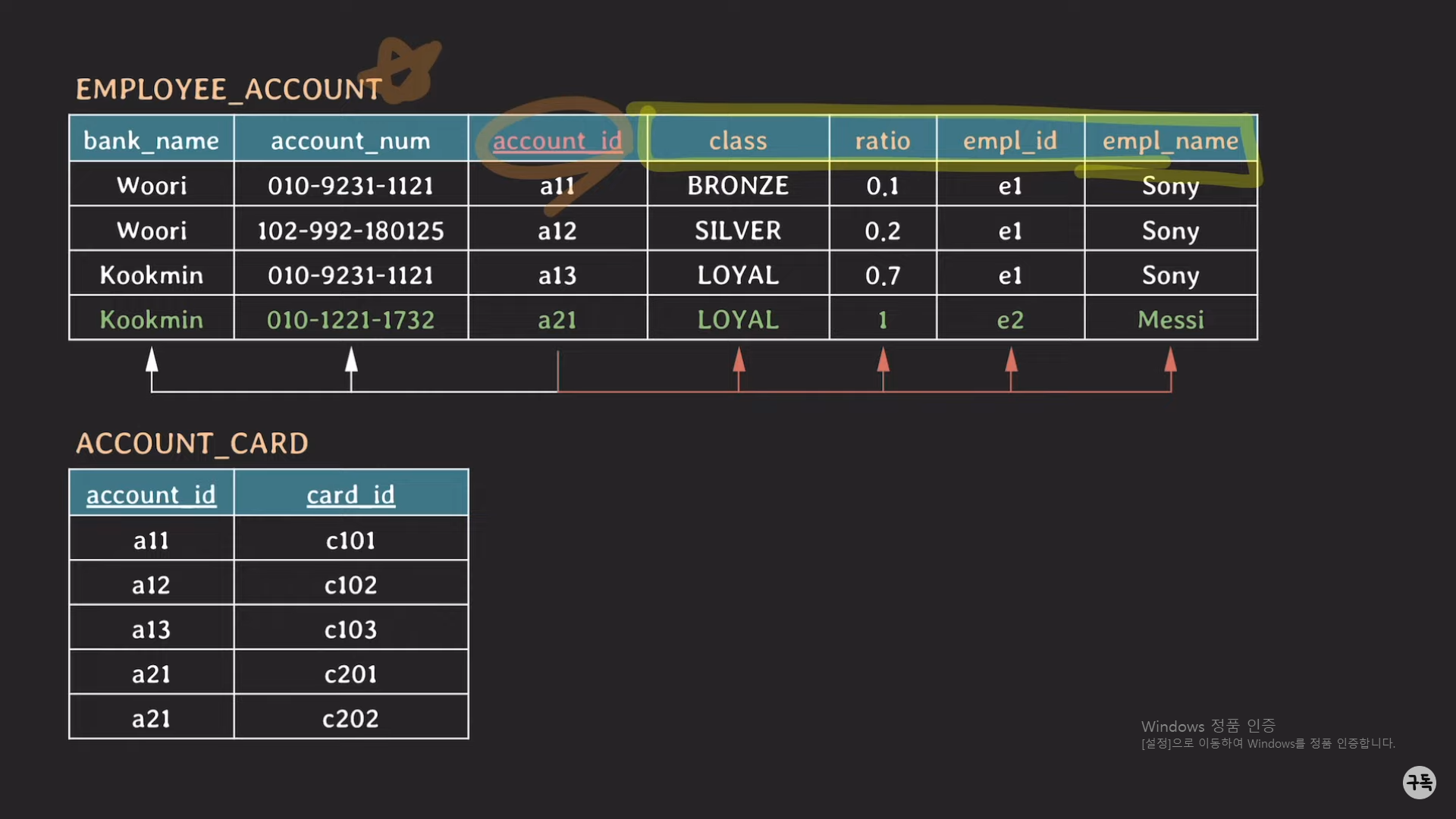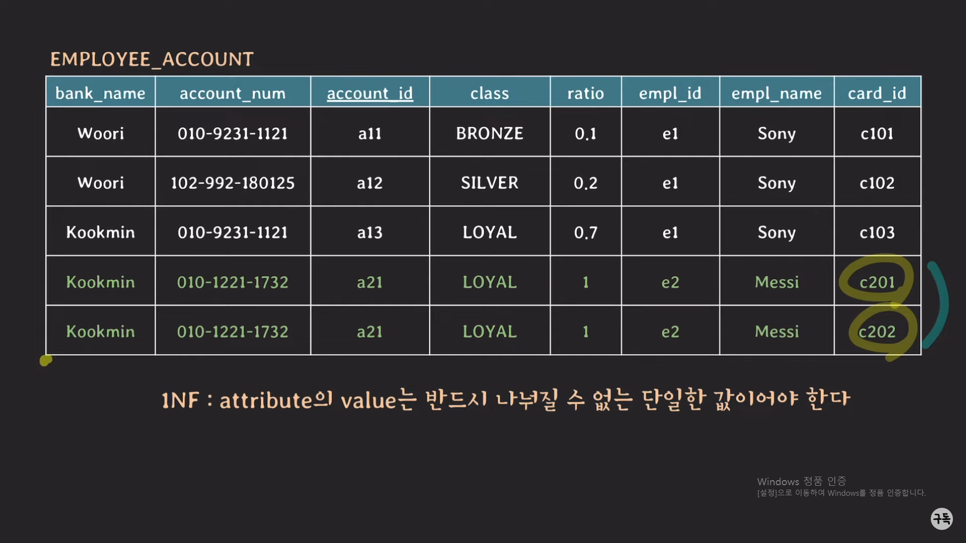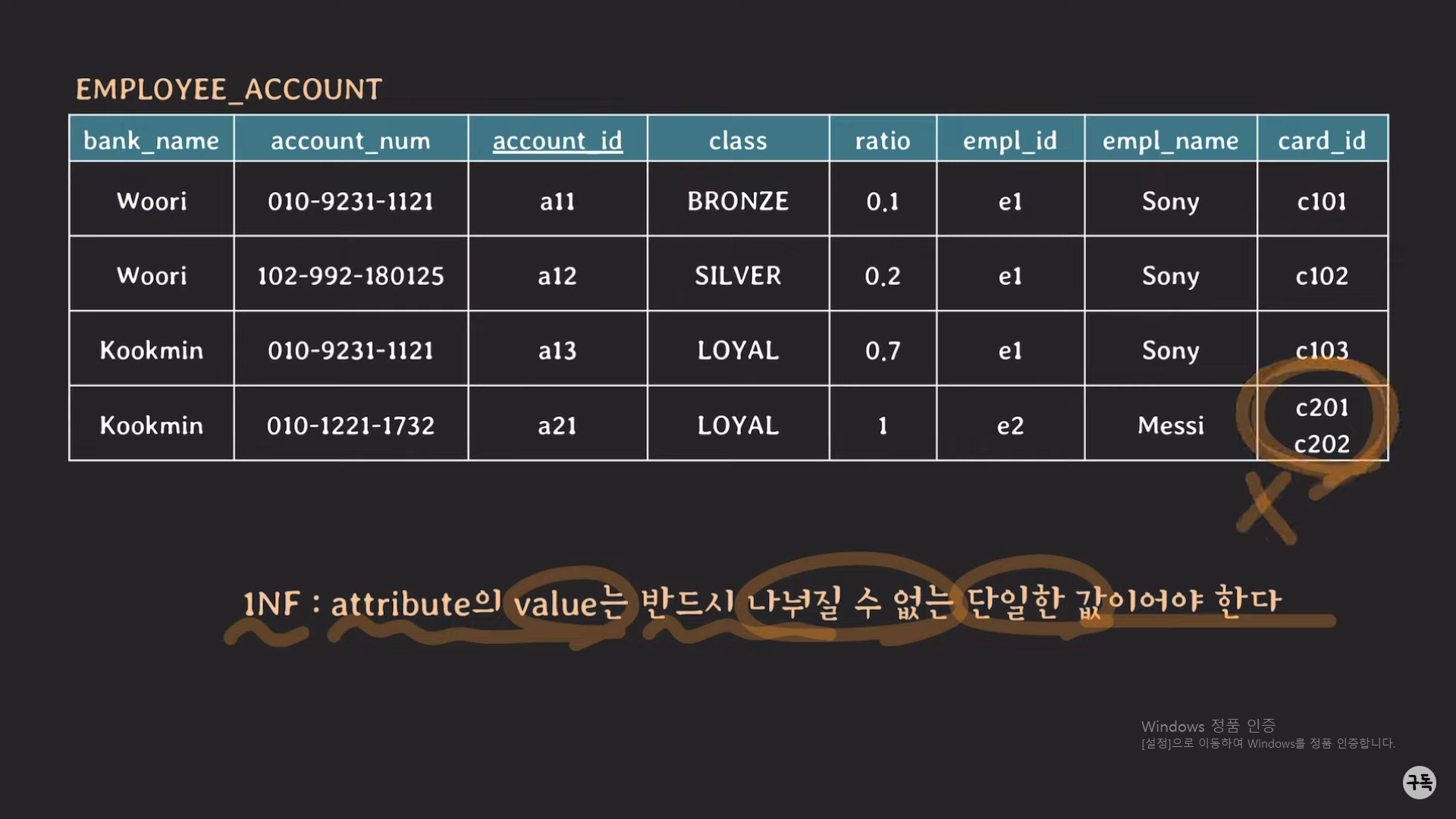 위의 1,2에 의해서 EMPLOYEE_ACCOUNT Table은 2NF를 만족하게 되었다.