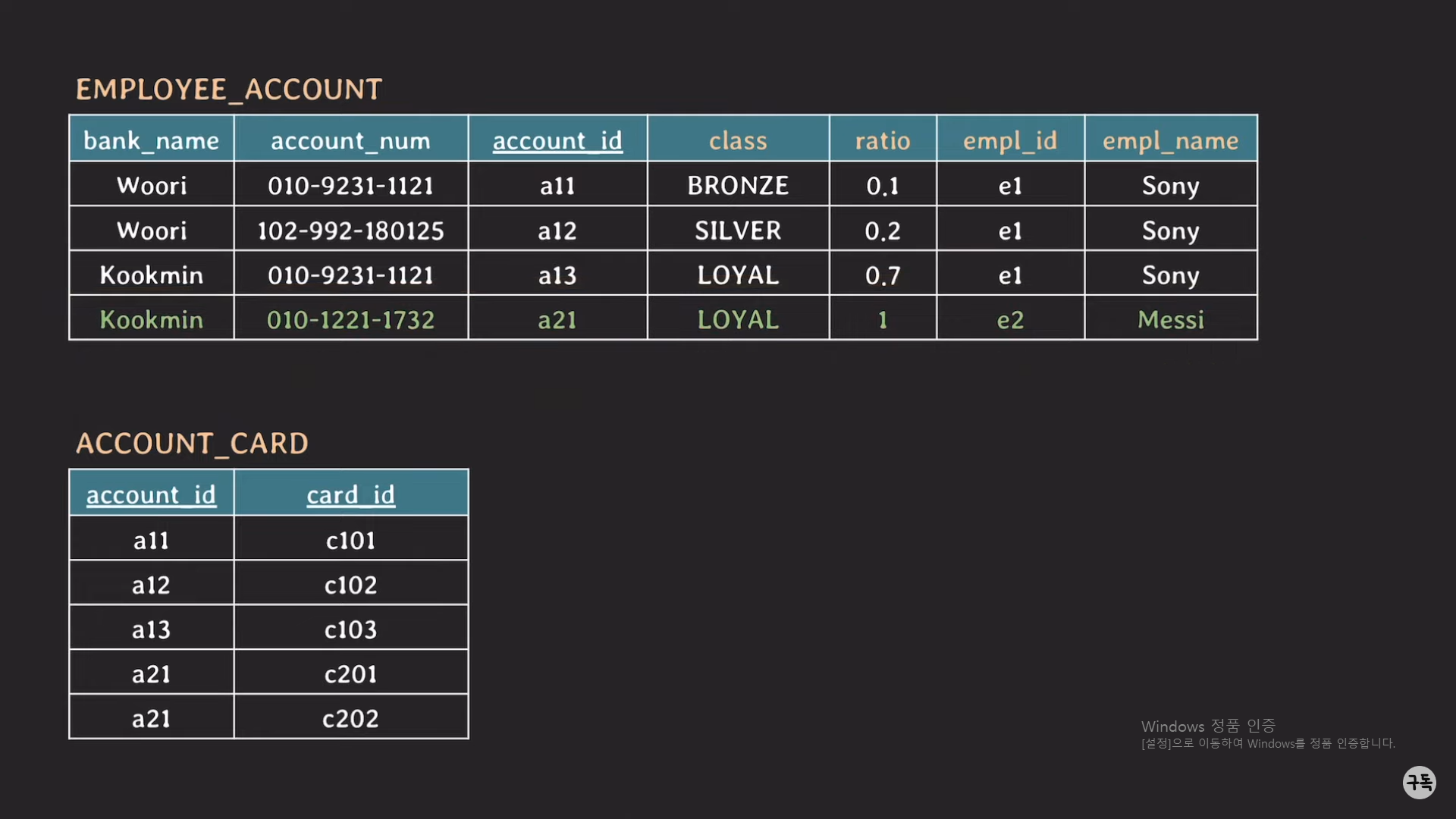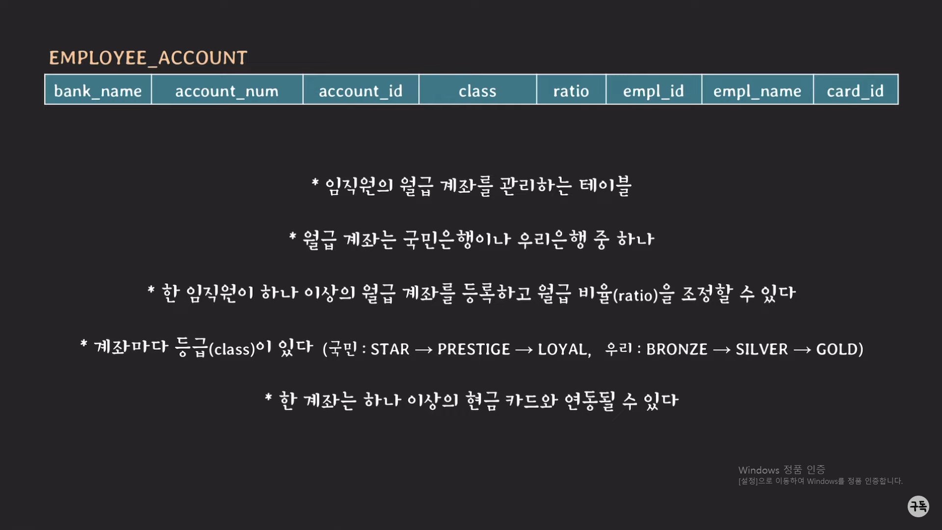 ACCOUNT_CARD에 account_id attribute를 foreign key로서 넣었다.(나중에 EMPLOYEE_ACCOUNT와의 JOIN을 위해)
