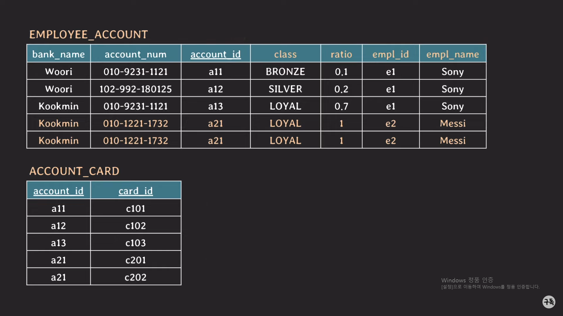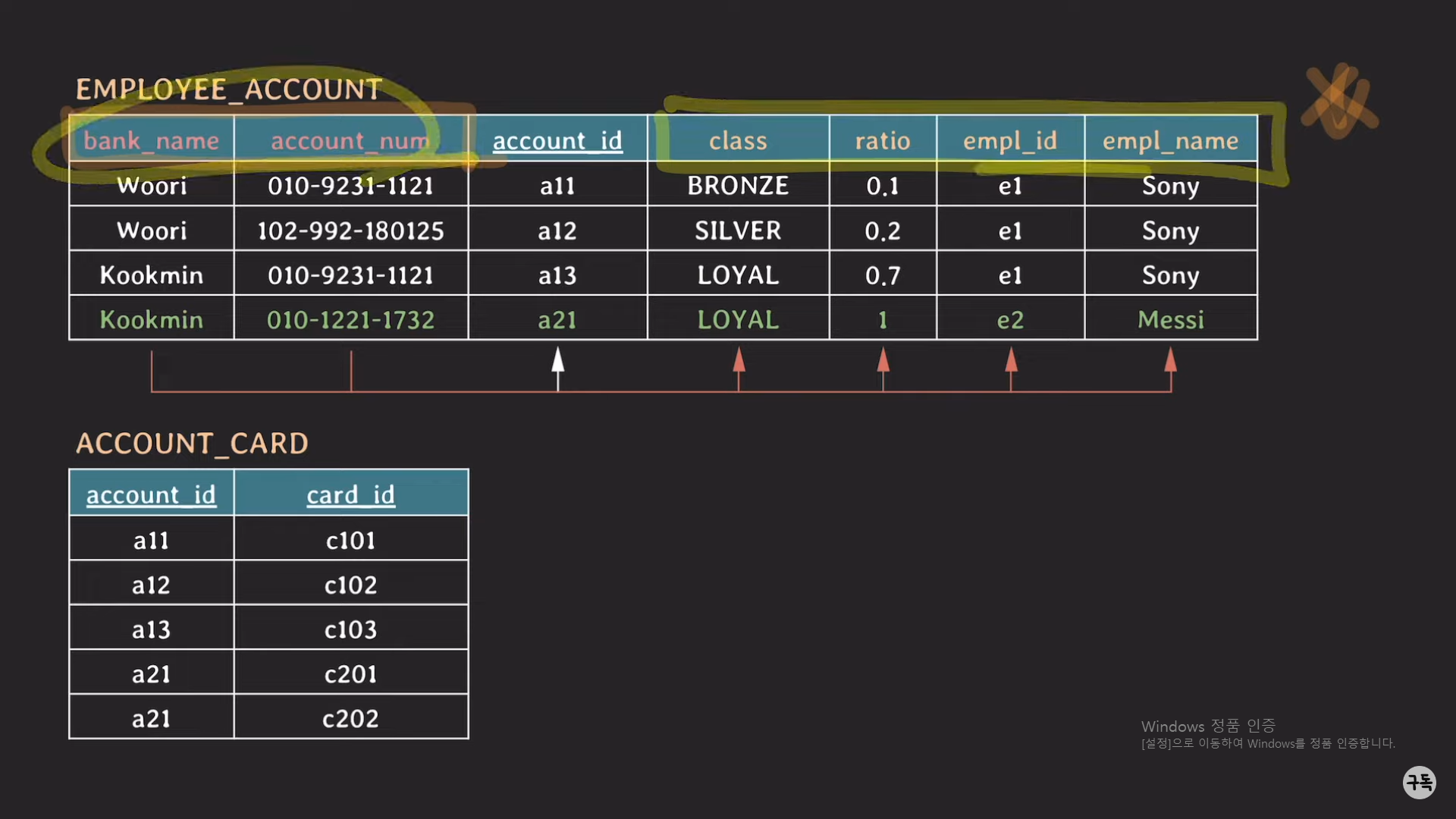 위 조건을 만족시키기 위하여 (candidate) key에서 card_id를 빼주고 아래와 같이 card_id를 다른 테이블을 생성하여 분할