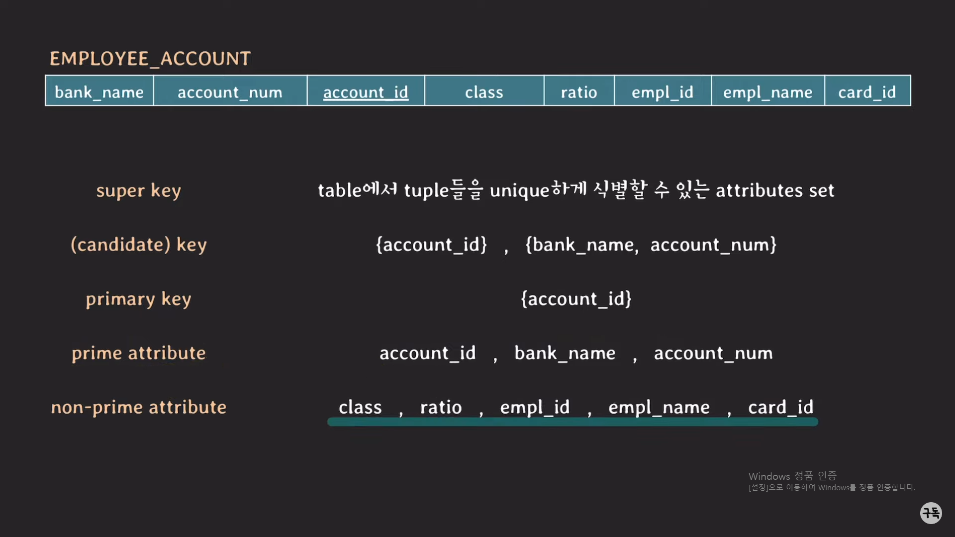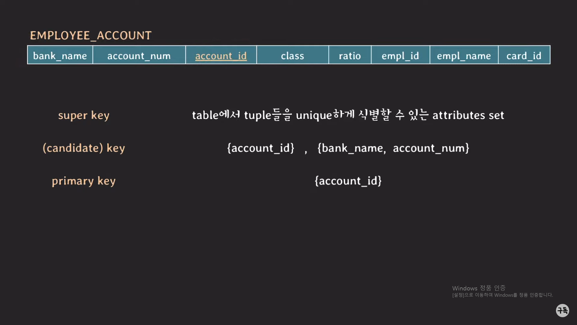 1. super key : table에서 tuple들을 unique하게 식별할 수 있는 attribute set