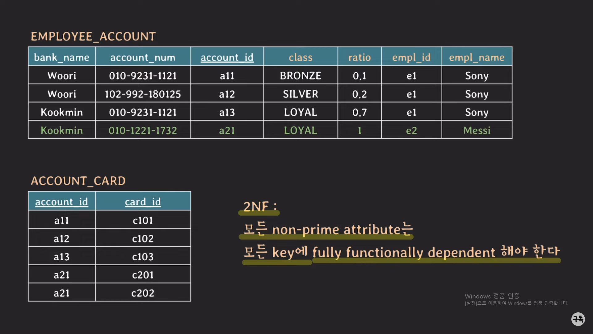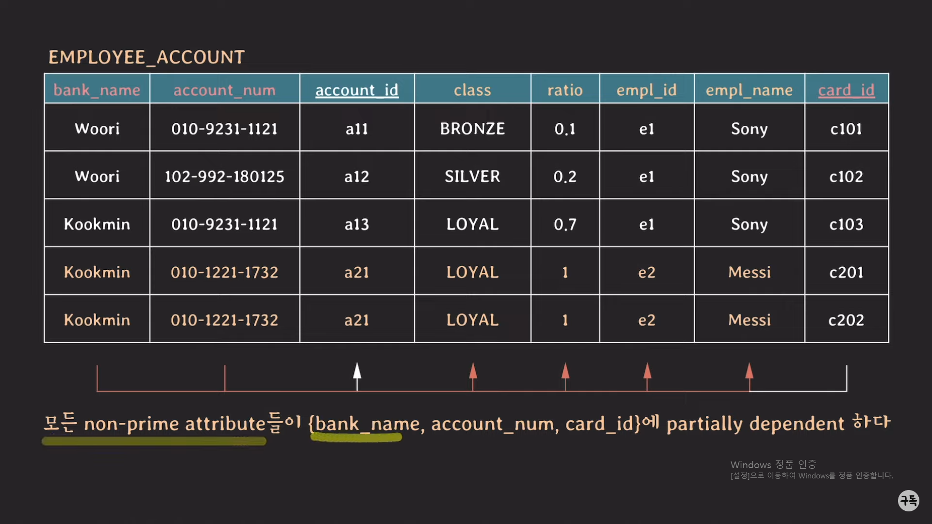 위 그림에 적힌 2NF의 정의에 의해, 모든 (candidate) key, 즉 {bank_name, account_id, card_id},{account_id,card_id}에