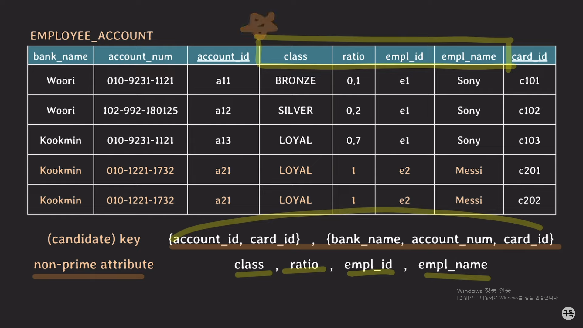 EMPLOYEE_ACCOUNT TABLE의 (candidate) key = {bank_name,account_num} , {account_id}는 모든 non prime key에