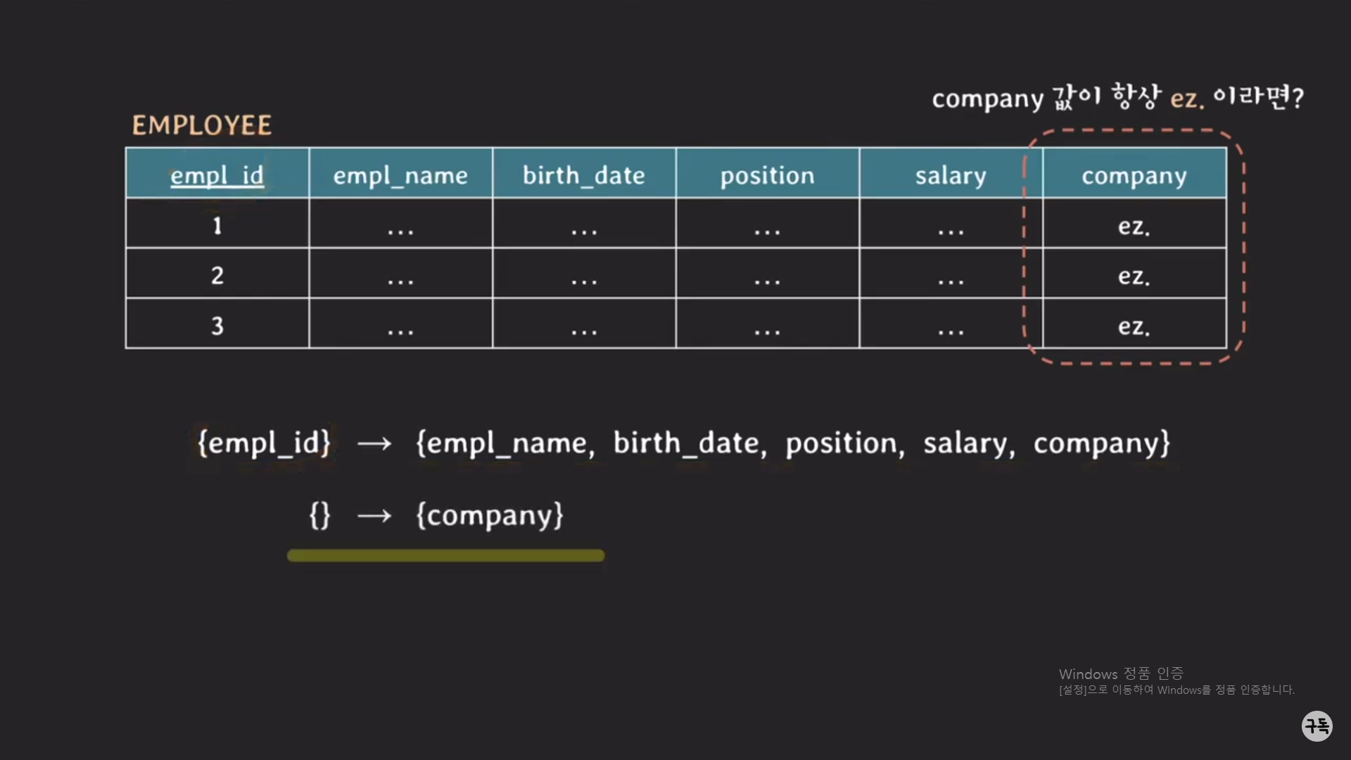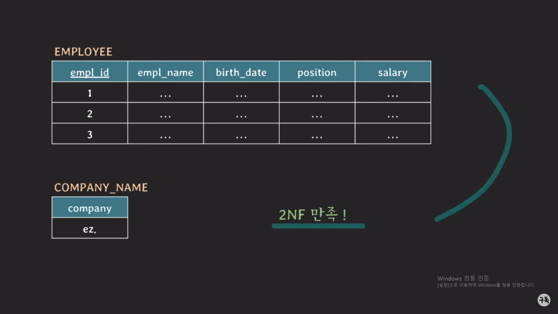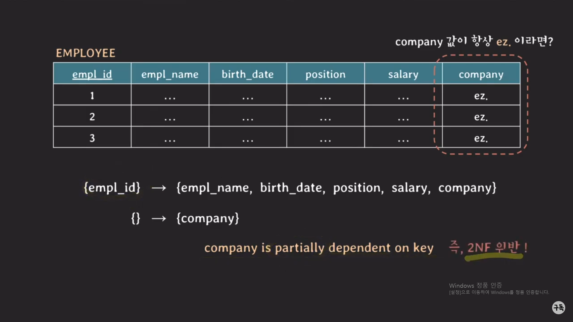 즉, EMPLOYEE 테이블의 KEY가 Composite key가 아닌데도 2NF를 만족하고 있지 않고 있다.