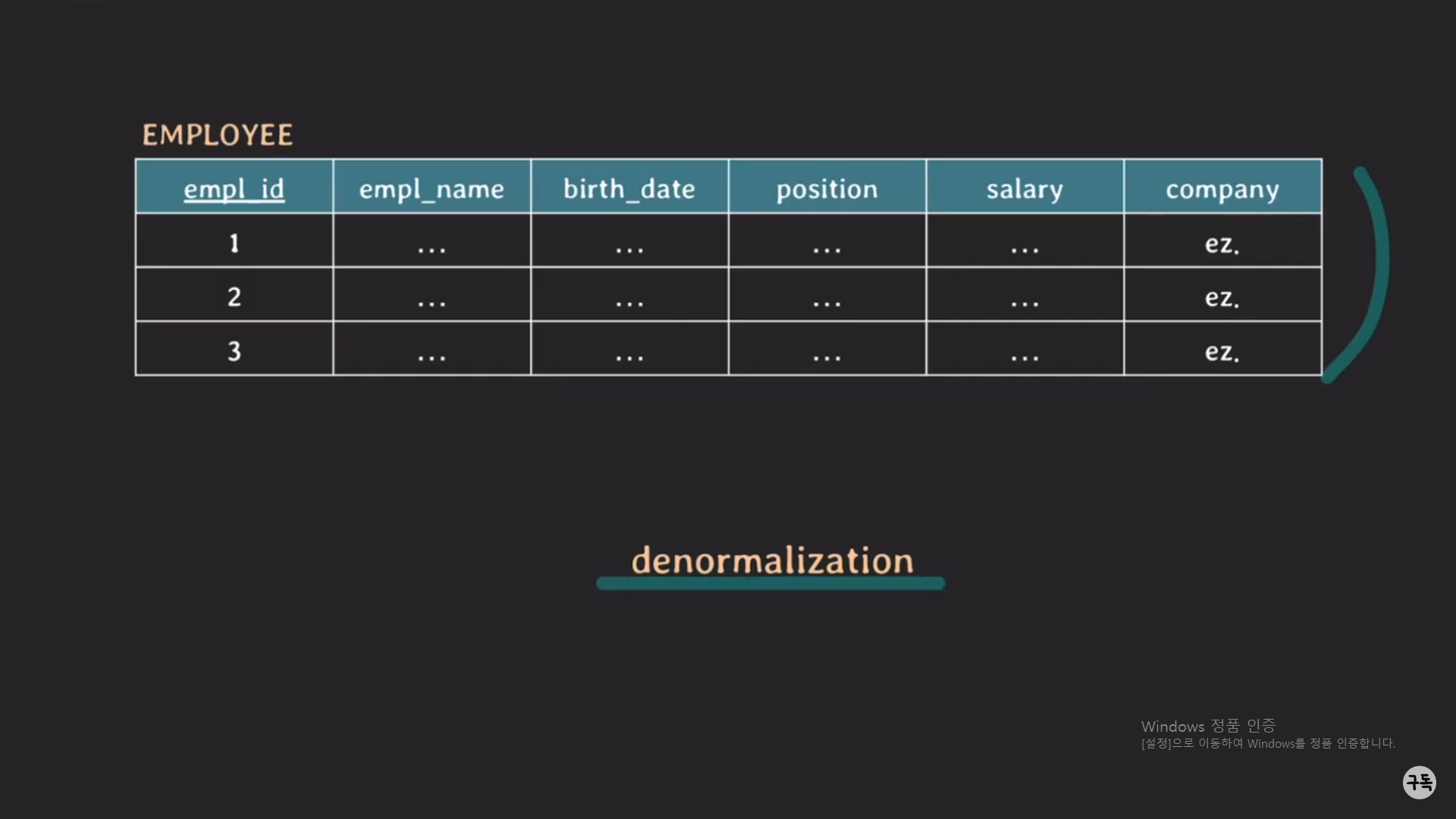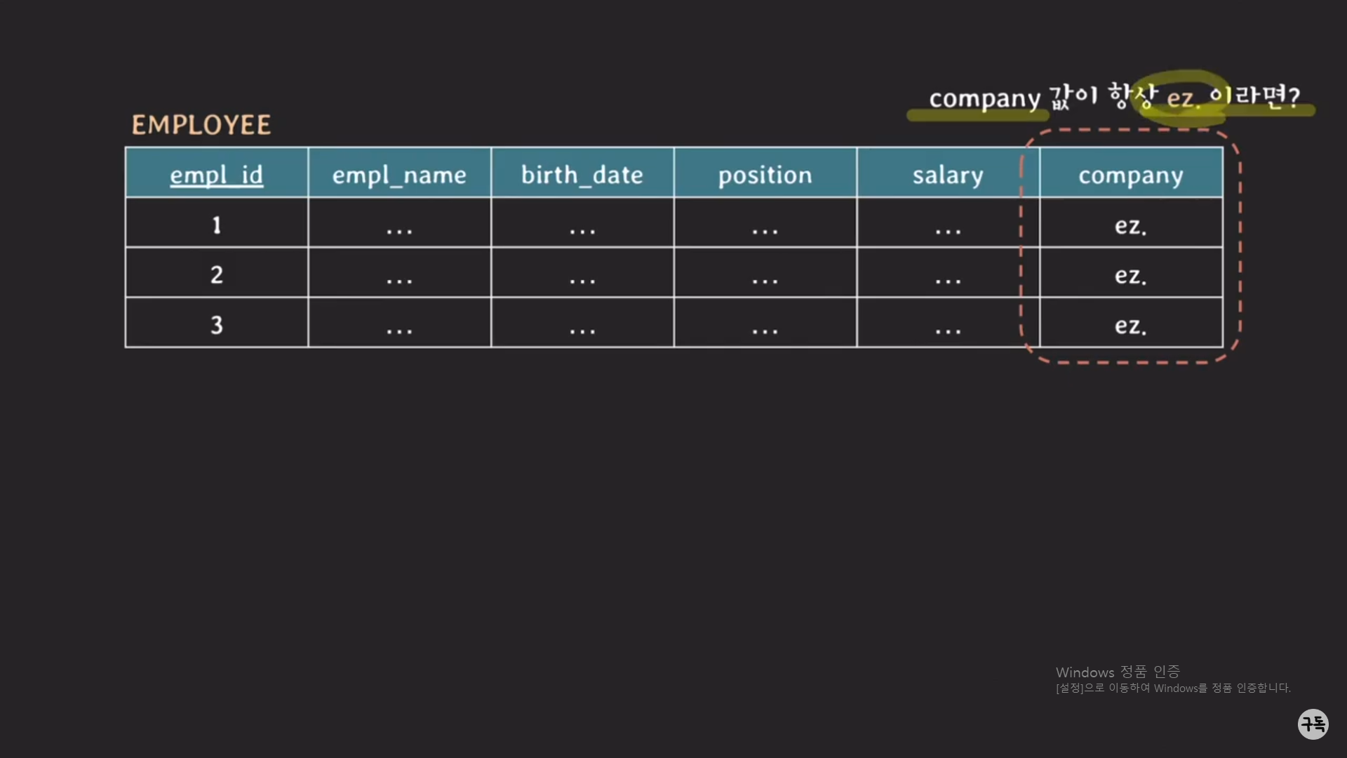 위와 같은 EMPLOYEE Table의 company attribute의 값이 항~~상 eg.인 경우를 생각해보자.