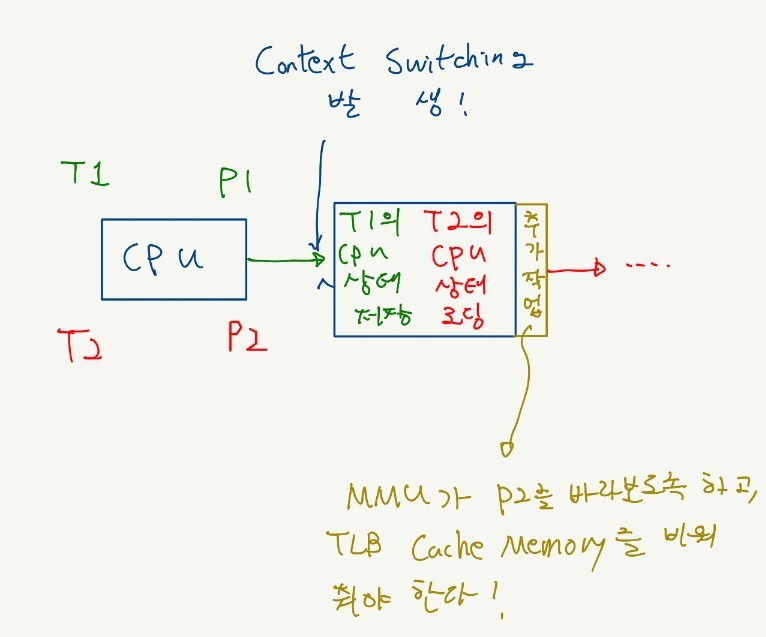 다른 프로세스끼리 사이의 문맥 교환에서는 가상 메모리 주소 체계 관련하여 추가 작업을 해줘야 한다.