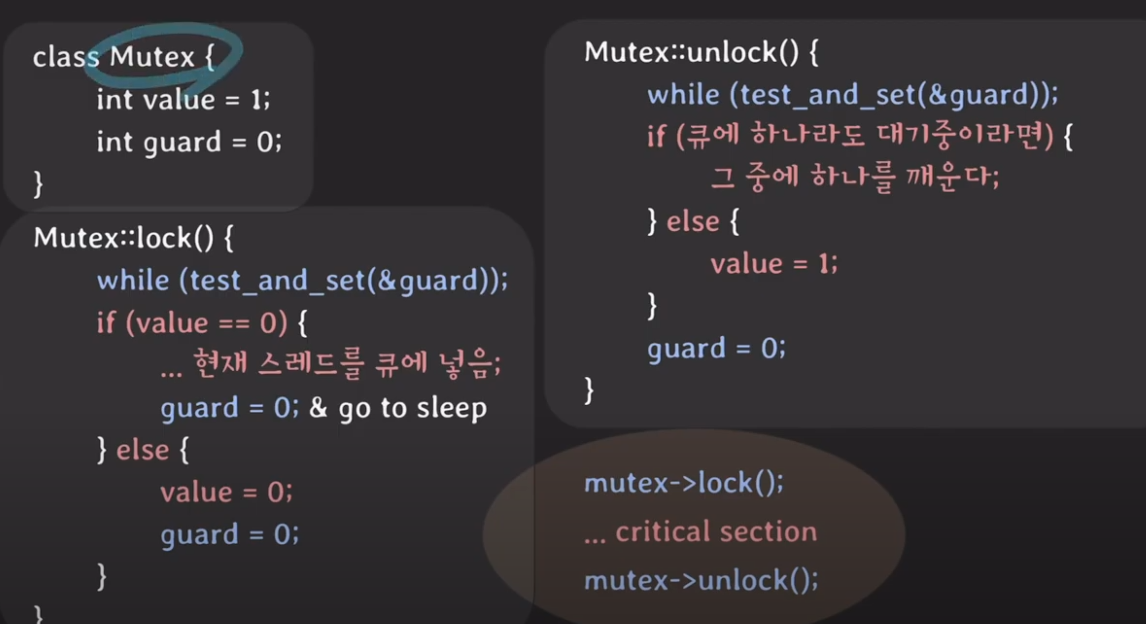 while(test_and_set(&lock) == 1) ; -> lock==1인 동안에는 무한 루프를 계속 돌며, critical section에 진입하기 못하게 한